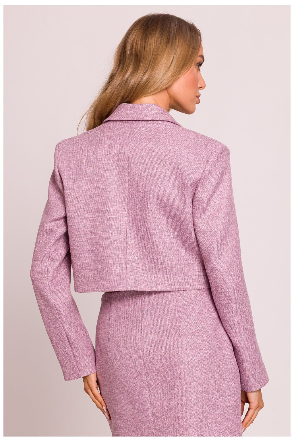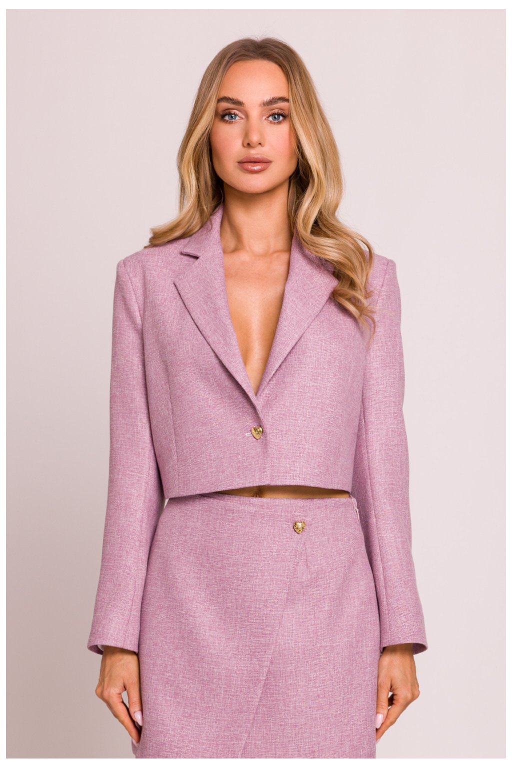 Elegantní krátký sako s nadčasovým střihem, vyrobený z vysoce kvalitní látky. Klasický límec dodává eleganci, a ozdobný srdcovitý knoflík dodává jemný, výjimečný akcent. Model je kompletně podšívkový, co zaručuje pohodlí nošení a perfektní přiléhání k postavě. Skvěle se hodí jak k elegantním, tak k ležérním stylizacím. Navržen a ušit v Polsku s pečlivostí o každý detail.