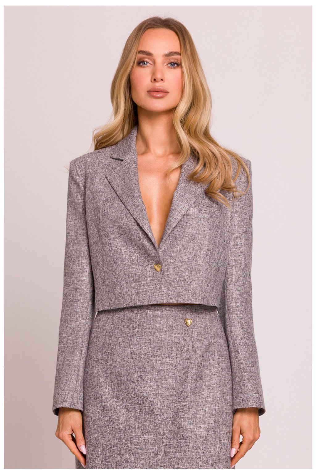 Elegantní krátký sako s nadčasovým střihem, vyrobený z vysoce kvalitní látky. Klasický límec dodává eleganci a ozdobný srdcový knoflík dodává jemný, výjimečný akcent. Model je kompletně podšitý, co zajišťuje pohodlí nošení a dokonalé padnutí na postavu. Skvěle ladí jak s elegantními, tak s volnými stylizacemi. Navrženo a ušito v Polsku s důrazem na každý detail.