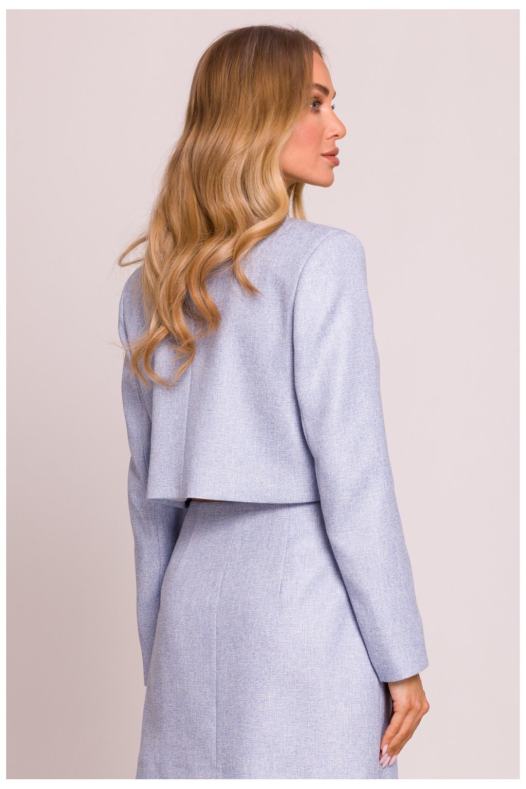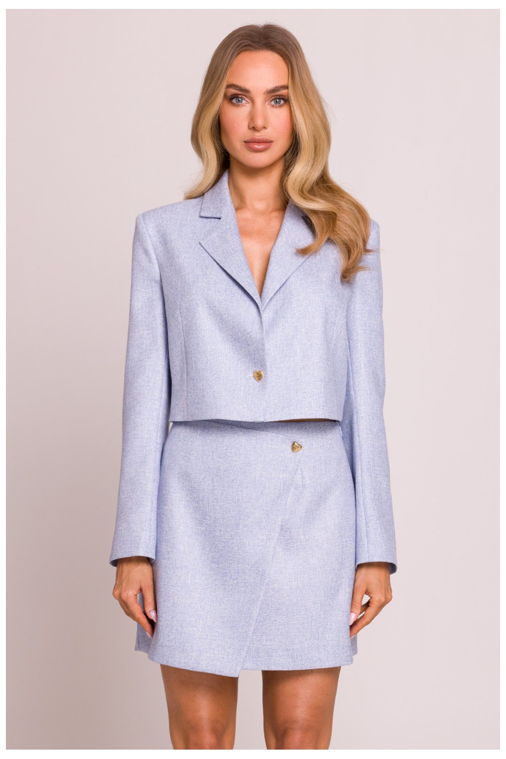 Elegantní krátký sako s nadčasovým střihem, vyrobený z vysoce kvalitní látky. Klasický límec dodává eleganci a ozdobný srdcovitý knoflík přidává jemný, výjimečný dotek. Model je kompletně podšitý, co zajišťuje pohodlí nošení a perfektní padnutí na postavu. Skvěle se hodí jak k elegantním, tak k casual stylizacím. Navržen a ušit v Polsku s pečlivostí o každý detail.