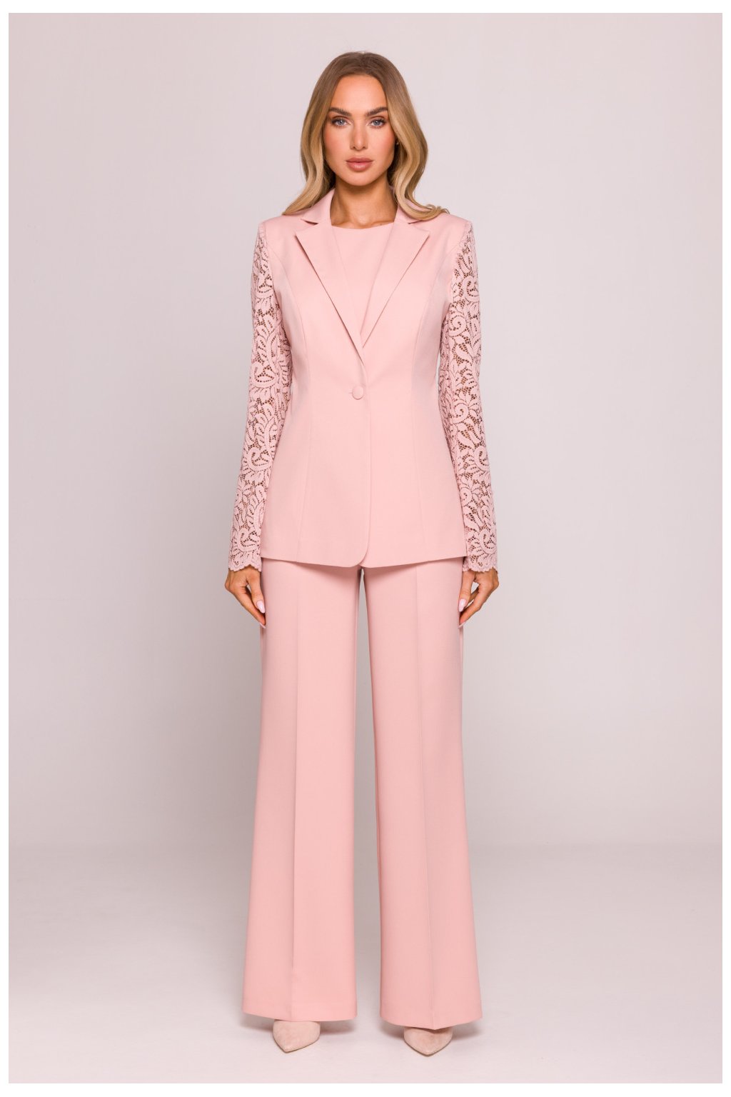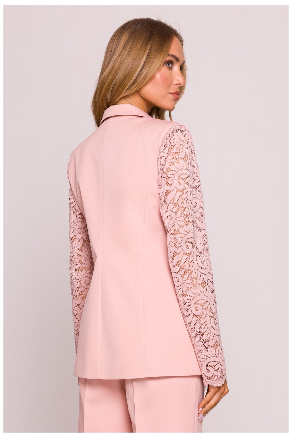 Elegantní sako, které spojuje nadčasový tvar s moderním detail. Vyšité z hladké, vysoce kvalitní látky, byly obohaceny o dlouhé rukávy z elastické krajky, které dodávají celku lehkost a ženský charakter. Klasický límec s klopkami a zapínání na jeden knoflík vpředu jí dodávají elegantní, vyvážený vzhled. Chybějící kapsy zdůrazňují čistotu formy a jemně tvarovaný střih s rovným dnem se krásně přizpůsobuje postavě, zdůrazňující její přednosti. Délka po boky z ní dělá skvělou volbu jak do formálních stylizací, tak do modernějších kombinací například s džíny nebo sukní. Navrženo a ušito v Polsku s důrazem na detaily a kvalitu provedení. Krajka 90% nylon, 10% spandex.