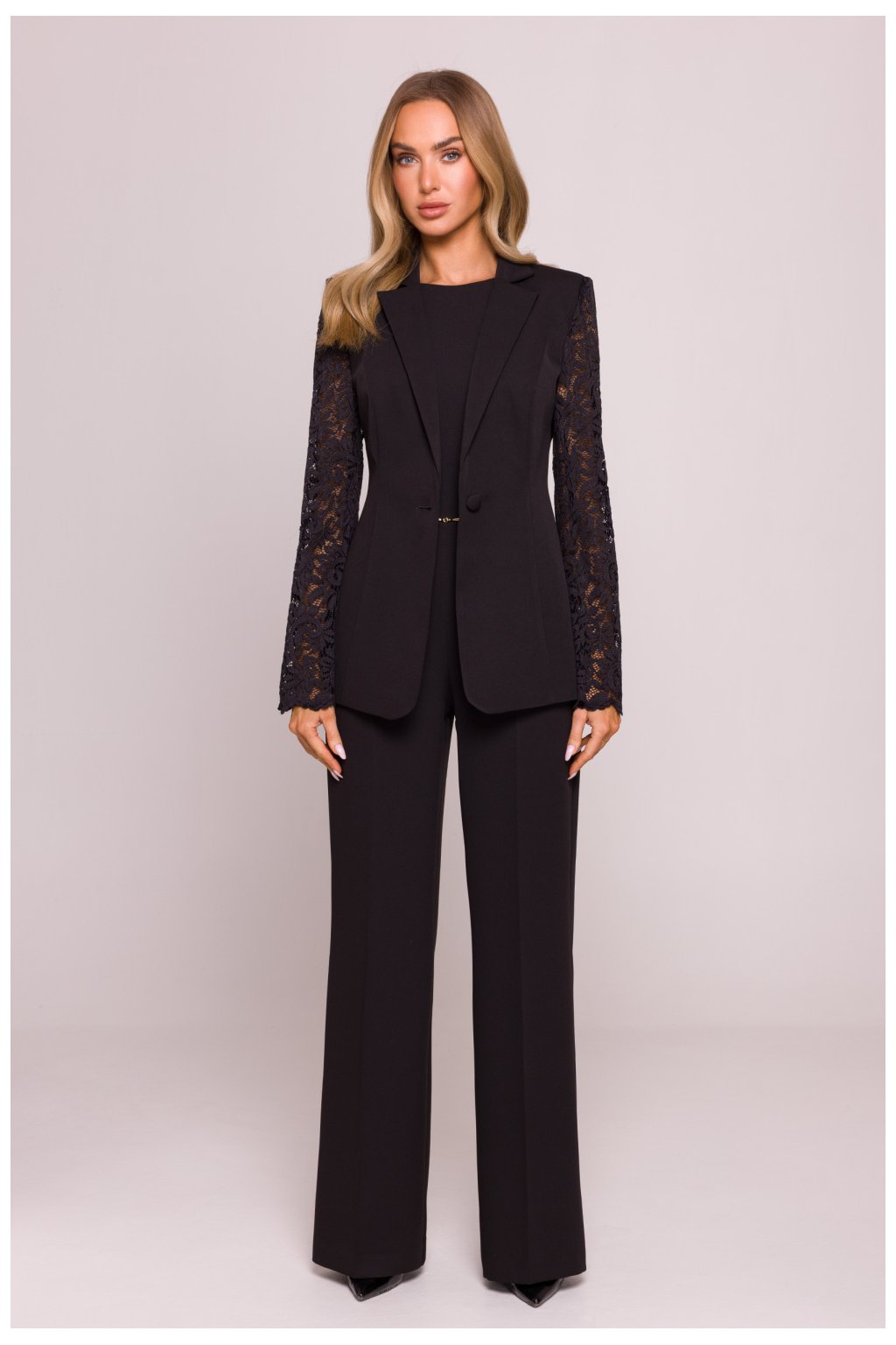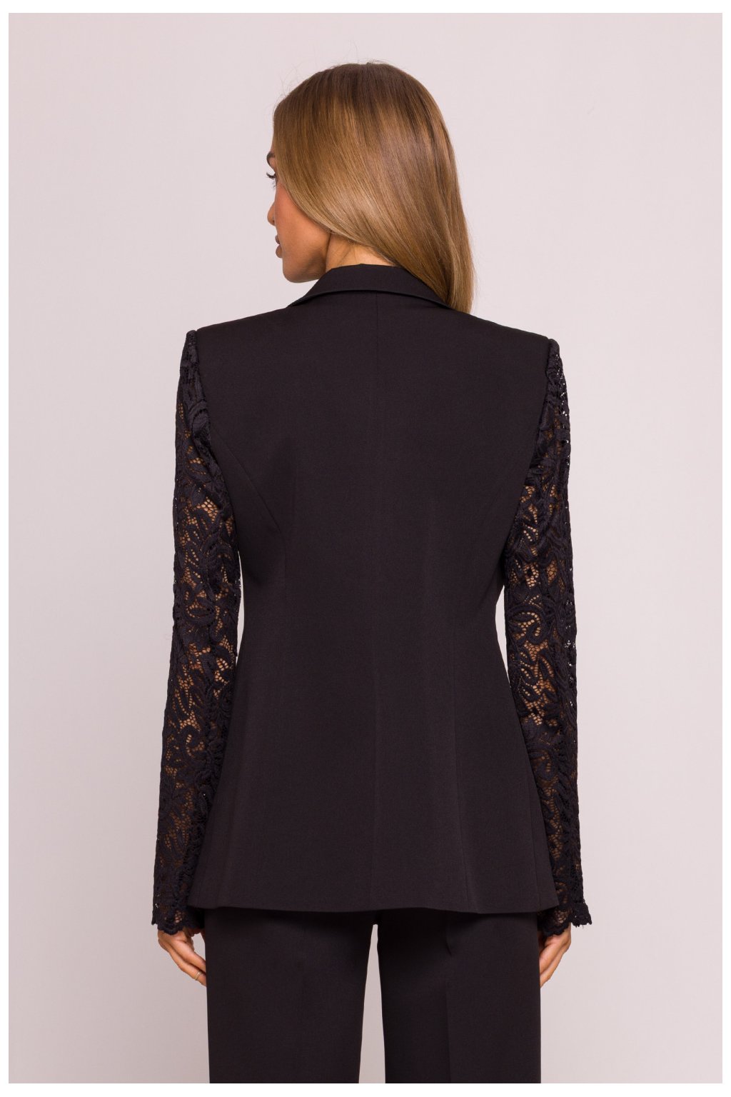 Elegantní sako, které spojuje nadčasový tvar s moderním detail. Vyrobena z hladké, vysoce kvalitní látky, byla obohacena o dlouhé rukávy z elastické krajky, které dodávají celku lehkost a ženský charakter. Klasický límeček s klopy a zapínání na jeden knoflík vpředu jí dodávají elegantní, vyvážený vzhled. Chybějící kapsy zdůrazňují čistotu formy a lehce talírovaný střih s rovným spodkem se krásně skládá na postavě, zdůrazňující její přednosti. Délka po boky z ní dělá skvělý doplněk jak do formálních stylizací, tak do modernějších kombinací např. s džíny nebo sukní. Navrženo a ušito v Polsku s důrazem na detaily a kvalitu zpracování. Krajka 90% nylon, 10% spandex.