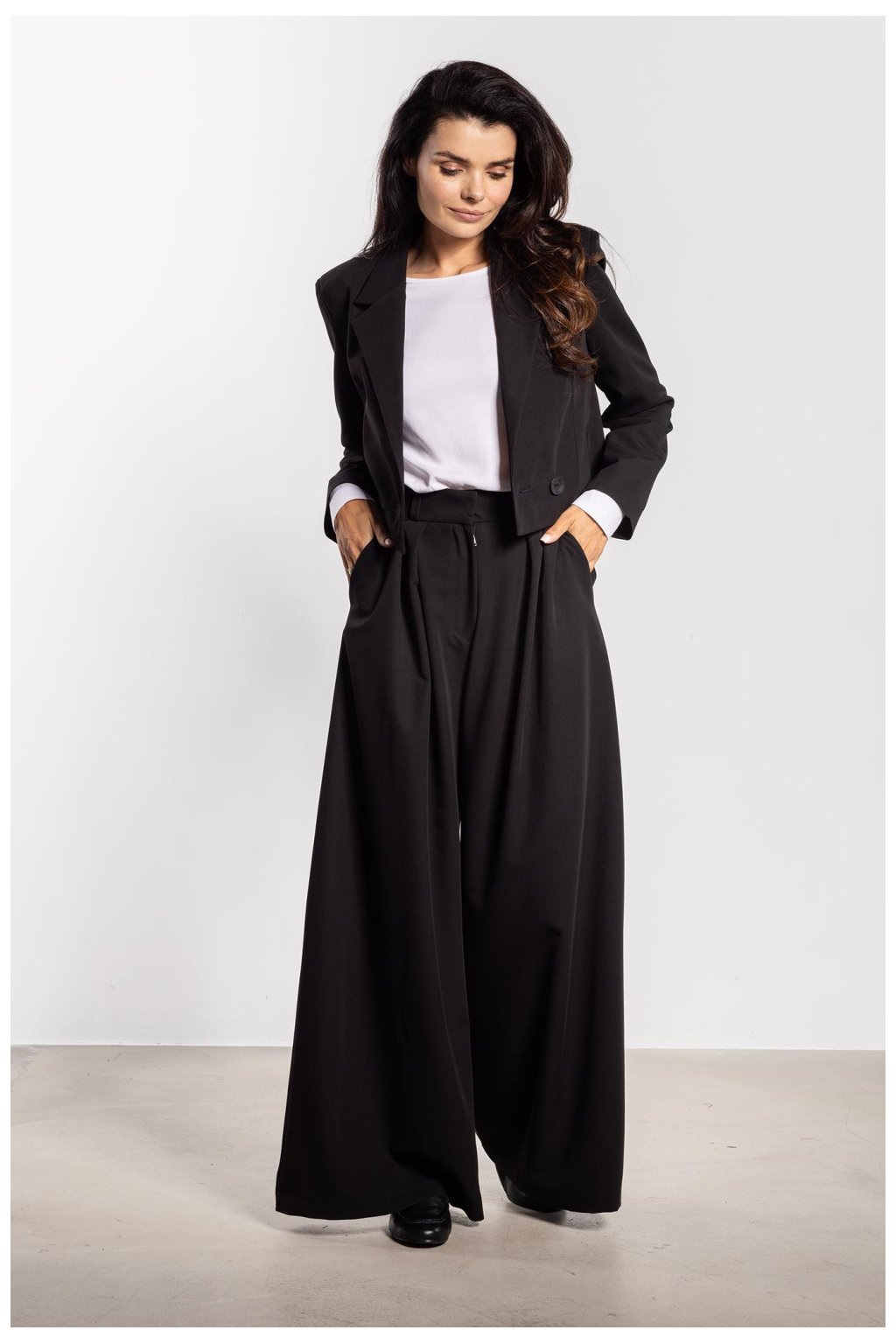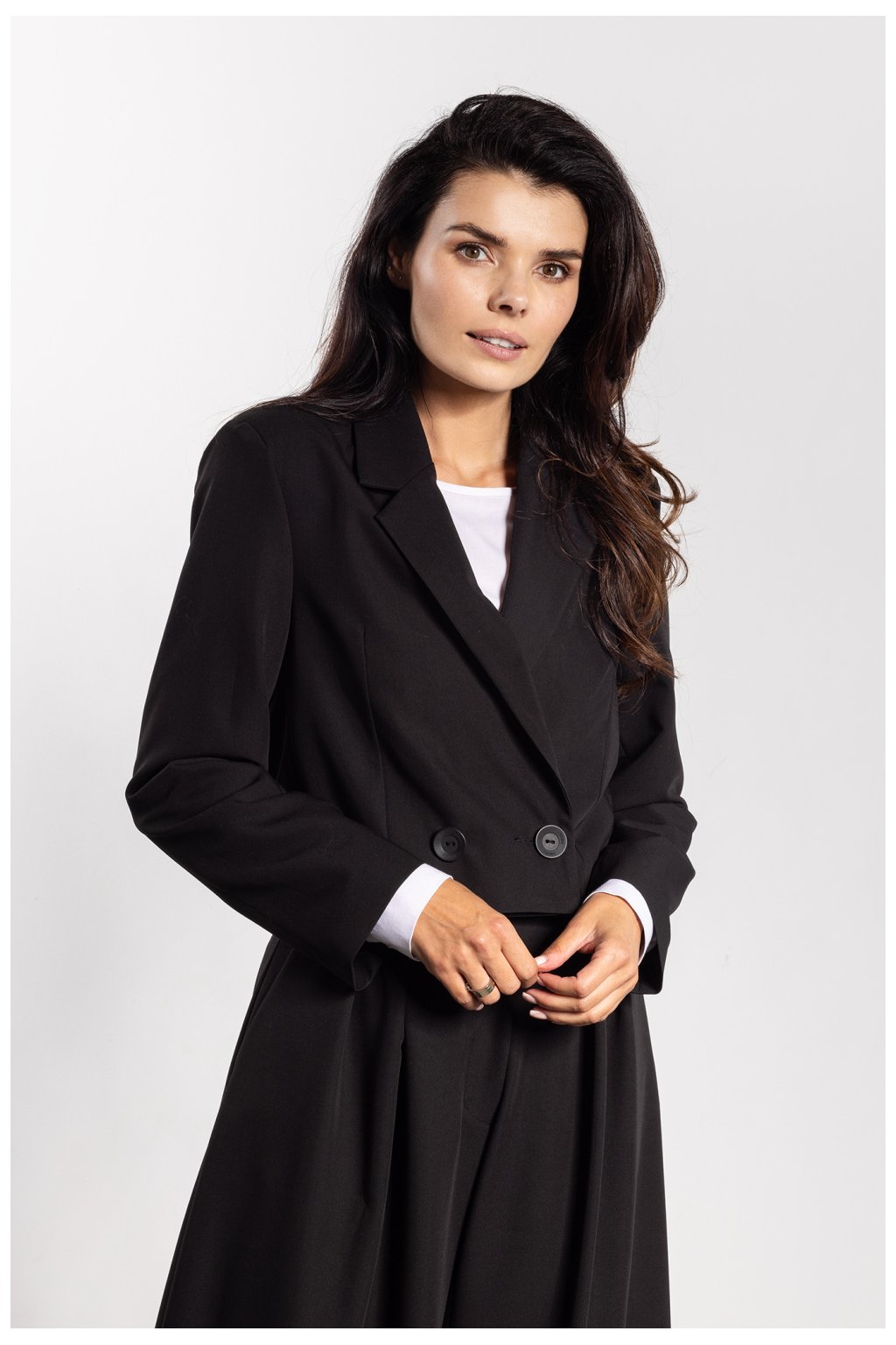 Elegantní sako s volným střihem spojuje klasiku s moderním charakterem. Kratší střih dodává lehkost, a dvouřadé zapínání na knoflíky zdůrazňuje eleganci. Klasické límce a přímá linie ramen dodávají sakru profesionální a elegantní vzhled, zároveň zajistí pohodlí při nošení. Skvěle ladí jak s širokými kalhotami, tak s sukní nebo šaty, vytvářejíce univerzální a efektní vzhled pro různé příležitosti.