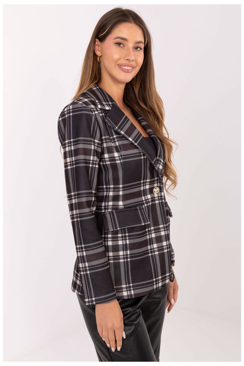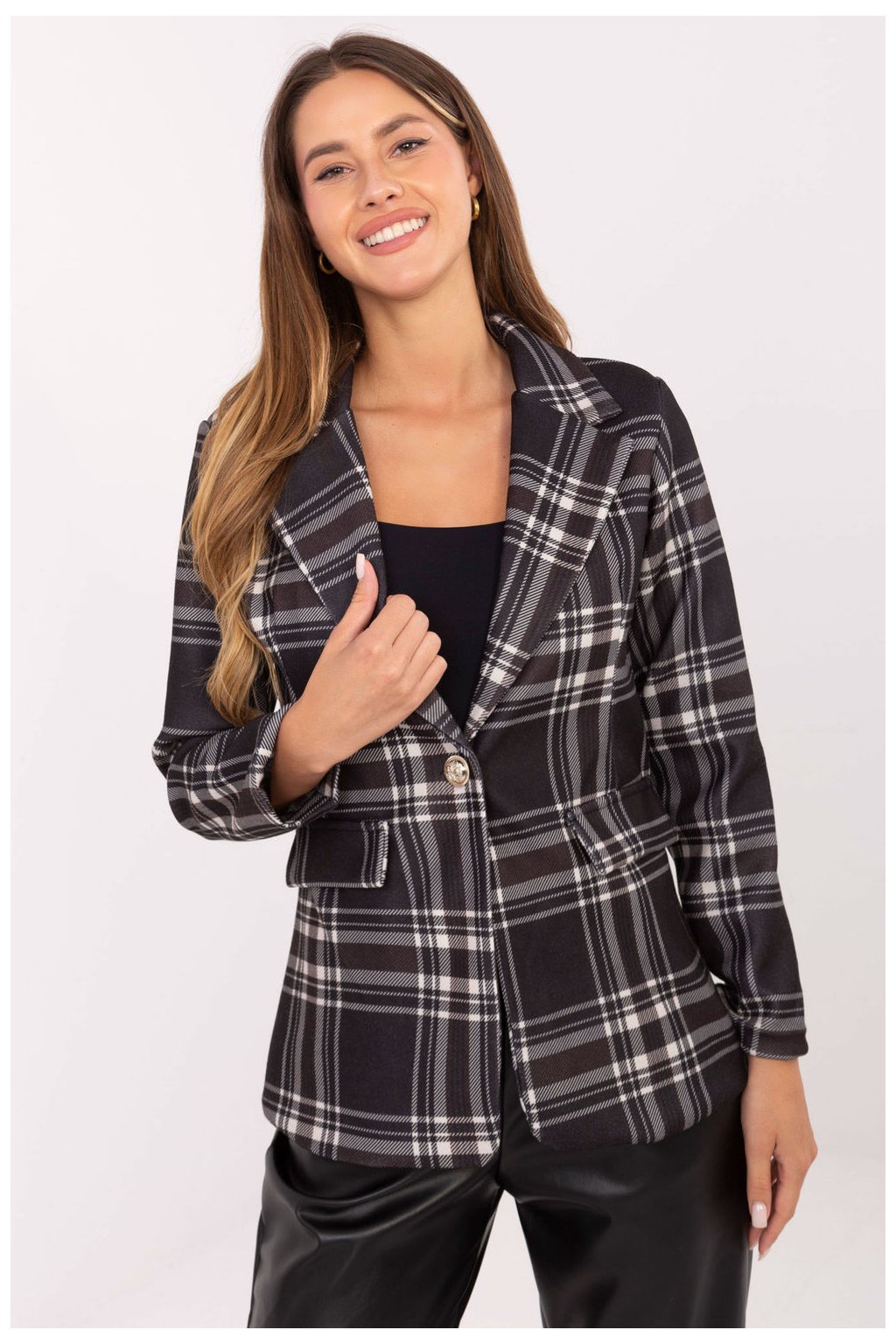 Dámský kostkovaný oblek v casual stylu je ideální volbou na každý den i do práce. Vyrobena z vysoké kvality polyesteru s podšívkou zajistí pohodlí a odolnost. Vložené polštářky na ramenou a přeložené límce dodávají siluetě strukturu, a jednořadé zapínání na knoflík zdůrazňuje elegantní charakter modelu. Dlouhý rukáv a standardní délka dělají z tohoto obleku skvělý doplněk jak klasických kalhot, tak šatům, vytvářející stylový a nadčasový outfit.