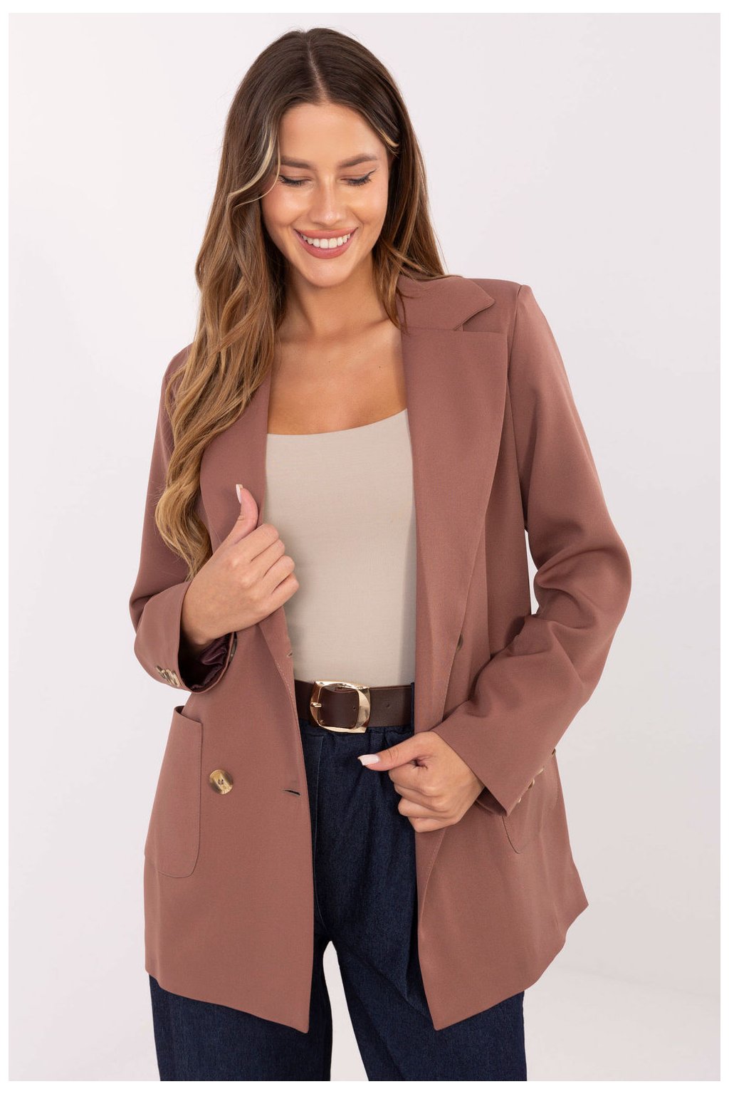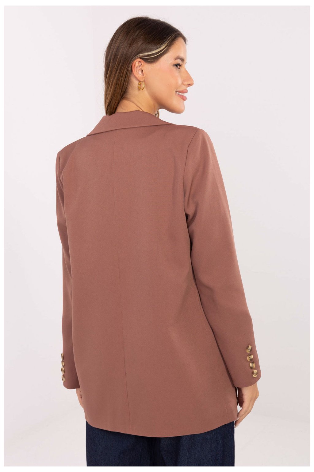 Elegantní dámský sako je klasický model, který se skvěle hodí jak do každodenních, tak do společenských stylizací. Vyrobený z vysoké kvality směsi bavlny, polyesteru a elastanu poskytuje pohodlí nošení, dokonalé přizpůsobení a elegantní vzhled po celý den. Model standardní délky s dlouhými rukávy ohromuje propracovanými ozdobnými knoflíky na rukávech a dvouřadým zapínáním vpředu. Hladká látka a nasazené kapsy dodávají celku třídu a funkčnost. Sako má podšívku, díky které se skvěle přizpůsobuje postavě a zdůrazňuje její proporce. Je to nadčasový střih, který skvěle doplní stylizace do práce, na obchodní schůzky nebo elegantní výlety.