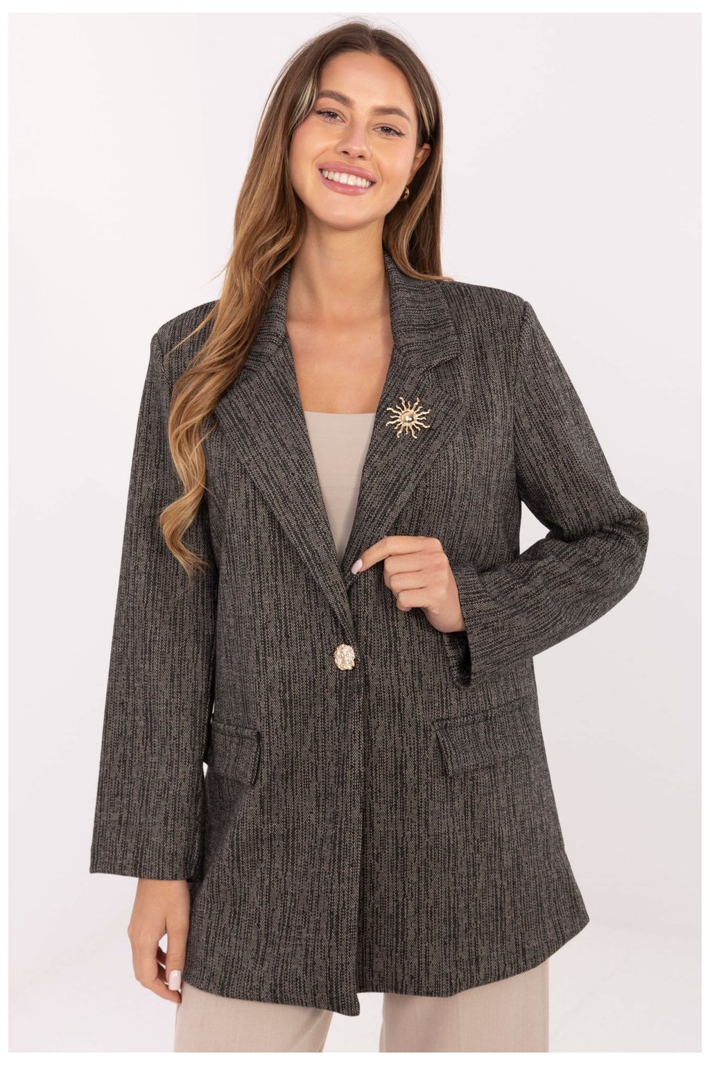 Elegantní a nadčasový dámský sako klasického střihu, ideální na společenské události a do práce. Ušito z vysoké kvality směsi polyesteru, viskózy a elastanu, díky čemuž skvěle padne, poskytuje pohodlí a lehce se přizpůsobuje siluetě. Model má standardní délku a dlouhé rukávy, jeho konstrukci zdůrazňují vestavěné polštářky na ramenou, které dodávají tvaru elegantní, lehce znatelný tvar. Obrácené límce a imitace kapes přidávají třídy a eleganci, a zapínání na jediný knoflík decentně zdůrazňuje pas. Sako je podšité, co zajišťuje pohodlí a ideální přizpůsobení. K celkovému šarmu přispívá ozdobná brož na límci, která představuje jemný, stylový akcent. Jedná se o elegantní sako s nadčasovým charakterem, které skvěle doplní jak společenské outfit, tak profesionální sestavy do práce. Skvěle vypadá v páru se kalhotami nebo sukní, vytvářejíc klasický a ženský look.