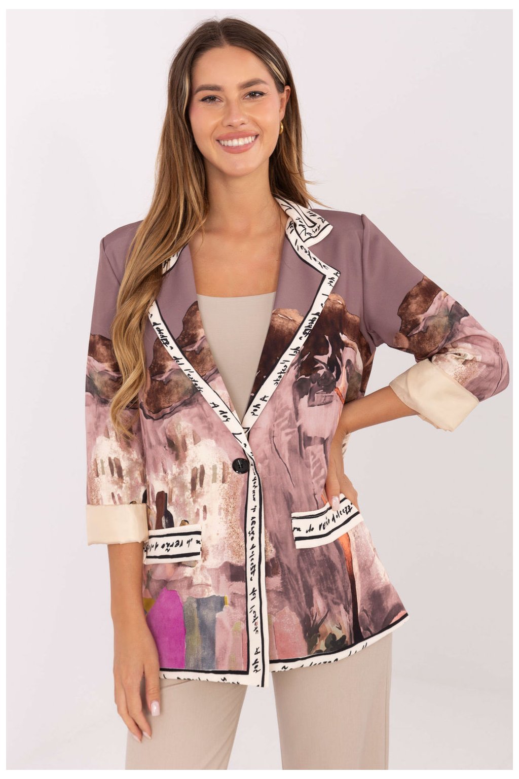 Dámský kabát s každodenním charakterem, ideální pro práci a casual stylizace. Vyrobený z viskózy a polyesteru s potiskem a decentními nápisy na celém materiálu, vyniká moderním, originálním designem. Model standardní délky s dlouhými rukávy, vestavěnými polštářky na ramenou a podšívkou zajistí elegantní střih a pohodlí nošení. Zapínání na knoflík zdůrazňuje klasický střih, hladká podšívka dodává lehkost a pohodlí.