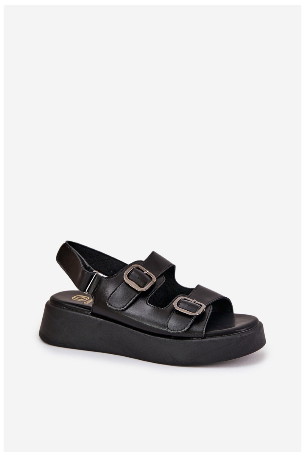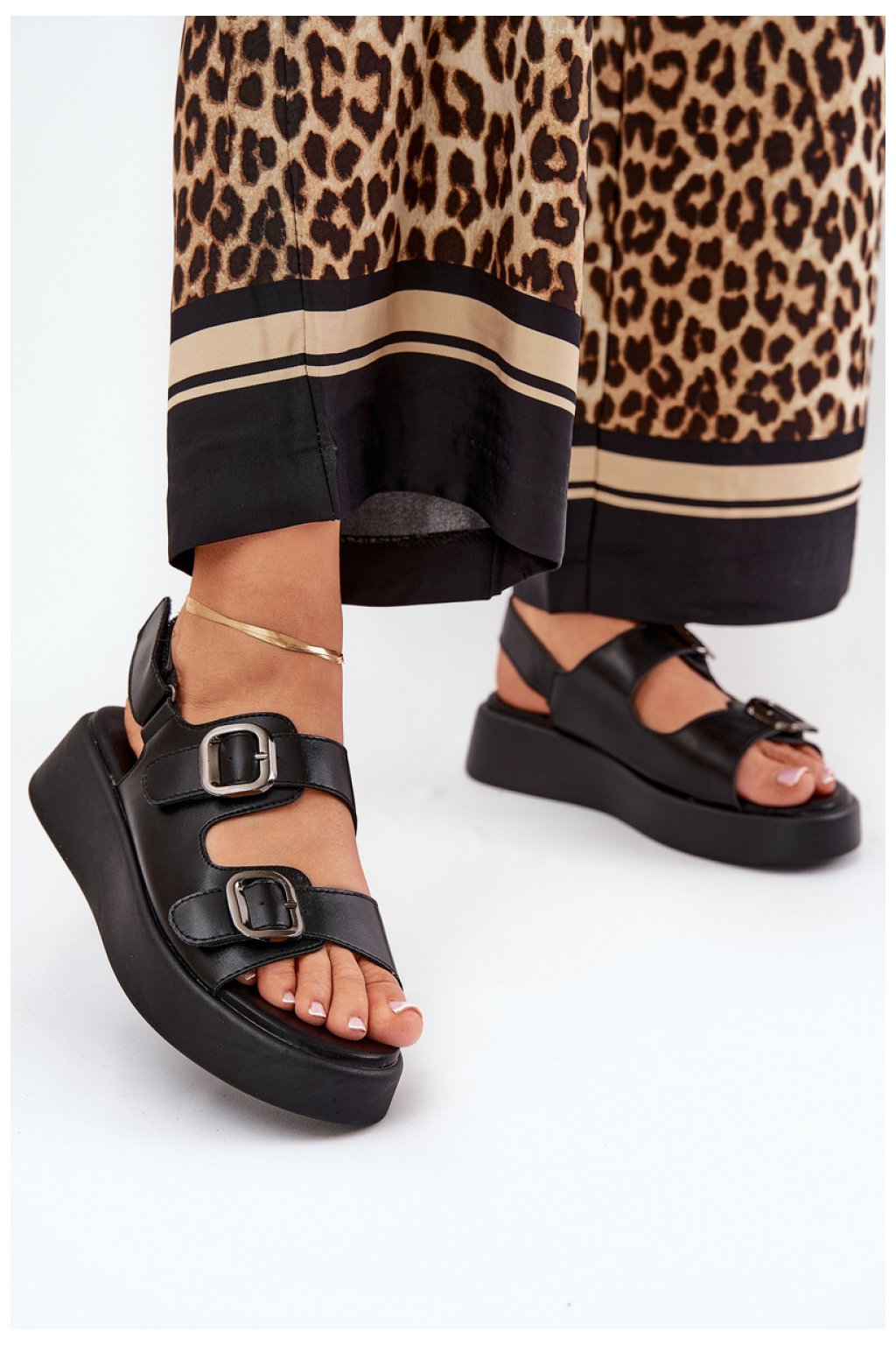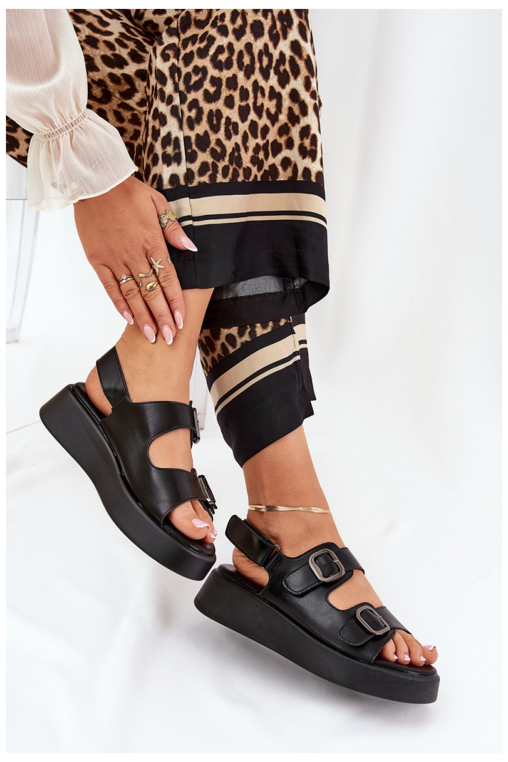 Stylové dámské sandály vyrobené z ekokůže. Umístěné na platformě a jemném podpatku, které spojují eleganci s pohodlím. Zapínají se na suchý zip vzadu, což zajišťuje snadné obouvání a svlékání, a nastavitelné popruhy s přezkami vpředu umožňují ideální přizpůsobení noze. Měkká stélka zaručuje pohodlí po celý den. Tyto žabky budou skvělou volbou na teplé dny, skvěle ladící s šaty, sukněmi nebo kalhotami.