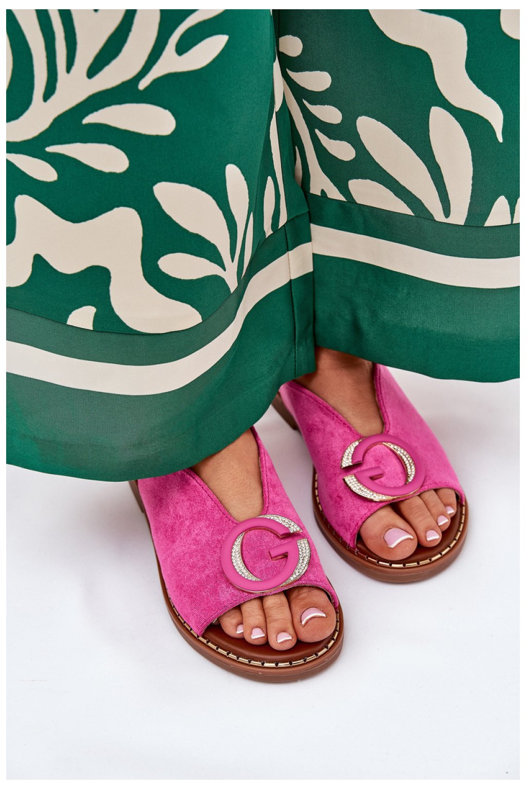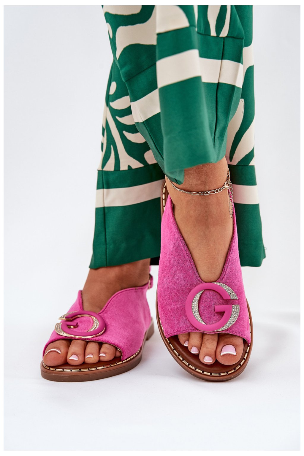 Ploché dámské sandály jsou vynikajícím návrhem na letní dny. Na přední straně se nachází ozdoba, která jim dodává jemné kouzlo, a nastavitelné řemínky s přezkou umožňují dokonalé přizpůsobení noze. Ekokůže stélky zajišťuje pohodlí po celý den. Tyto sandály kombinují styl s funkčností a představují skvělý doplněk jak každodenních, tak i elegantnějších stylizací.