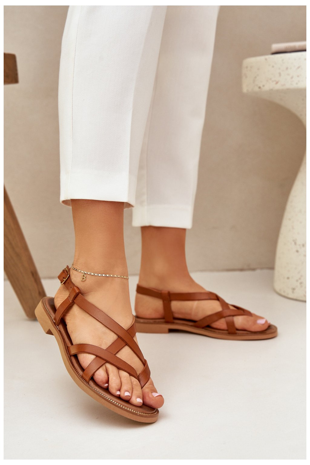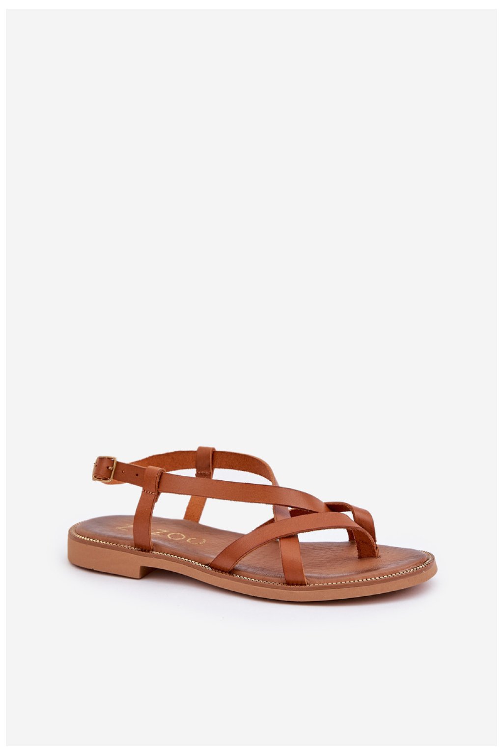 Ploché sandály vyrobené z přírodní kůže jsou elegantním návrhem pro teplé dny. Zapínají se na nastavitelný popruh s přezkou, co umožňuje ideální přizpůsobení noze. Propletené pásy jim dodávají decentní, ale zároveň moderní vzhled. Tyto sandály kombinují pohodlí s módním designem a skvěle se hodí jak na každodenní nošení, tak i do elegantnějších stylizací.