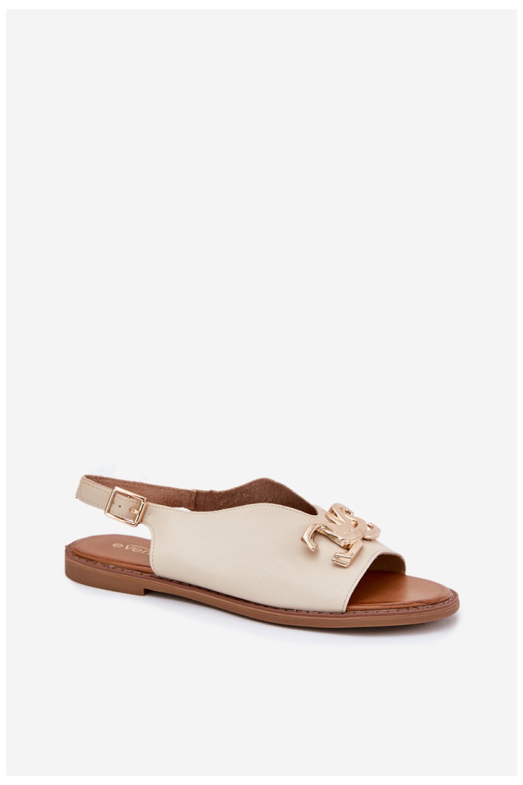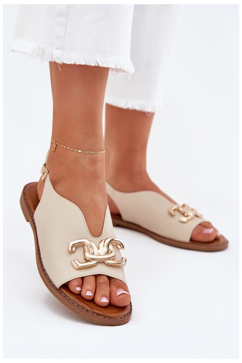 Dámské sandály ze syntetické kůže na plochém podpatku jsou skvělým návrhem na teplé dny. Model se vyznačuje zlatým doplňkem, který jim dodává zvláštní kouzlo. Zapínání na přezku s nastavitelným řemínkem zajistí ideální přizpůsobení noze. Skvěle se hodí k letním šatům, sukním a kalhotám.