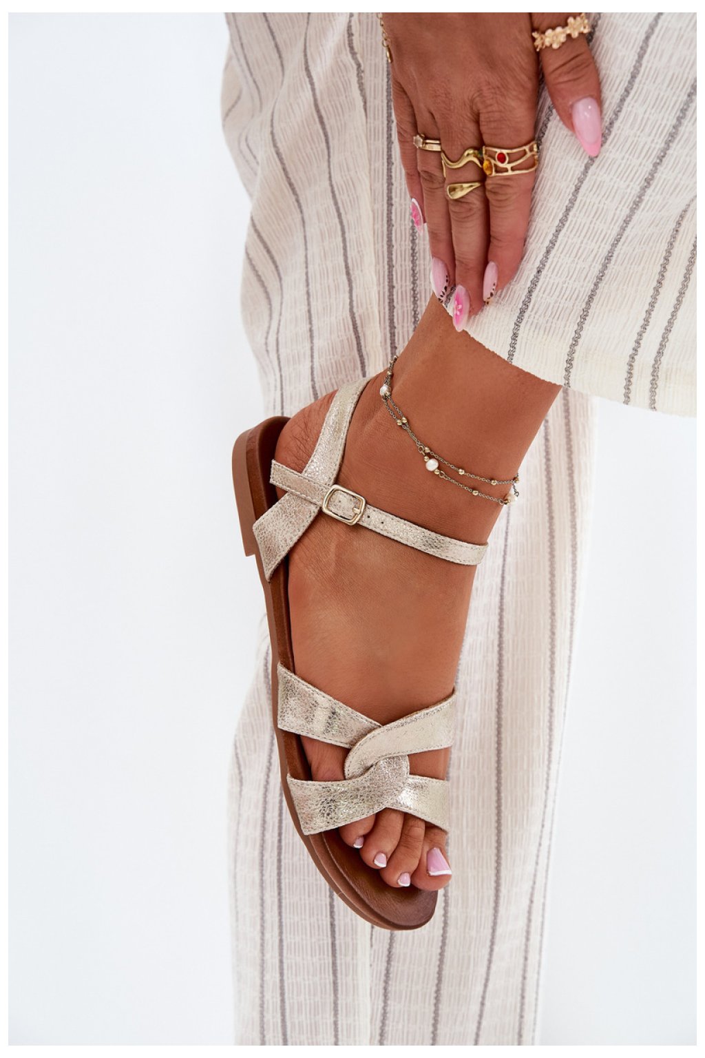 Dámské sandály vyrobené z vysoce kvalitní ekokože jsou klasickou volbou na teplé dny. Model se zapínáním na sponu s nastavitelným popruhem umožňuje ideální přizpůsobení noze a poskytuje pohodlí po celý den. Plochá podrážka zajišťuje pohodlí a stabilitu a klasický střih zase zajišťuje, že tyto sandály skvěle ladí s různými letními stylizacemi.