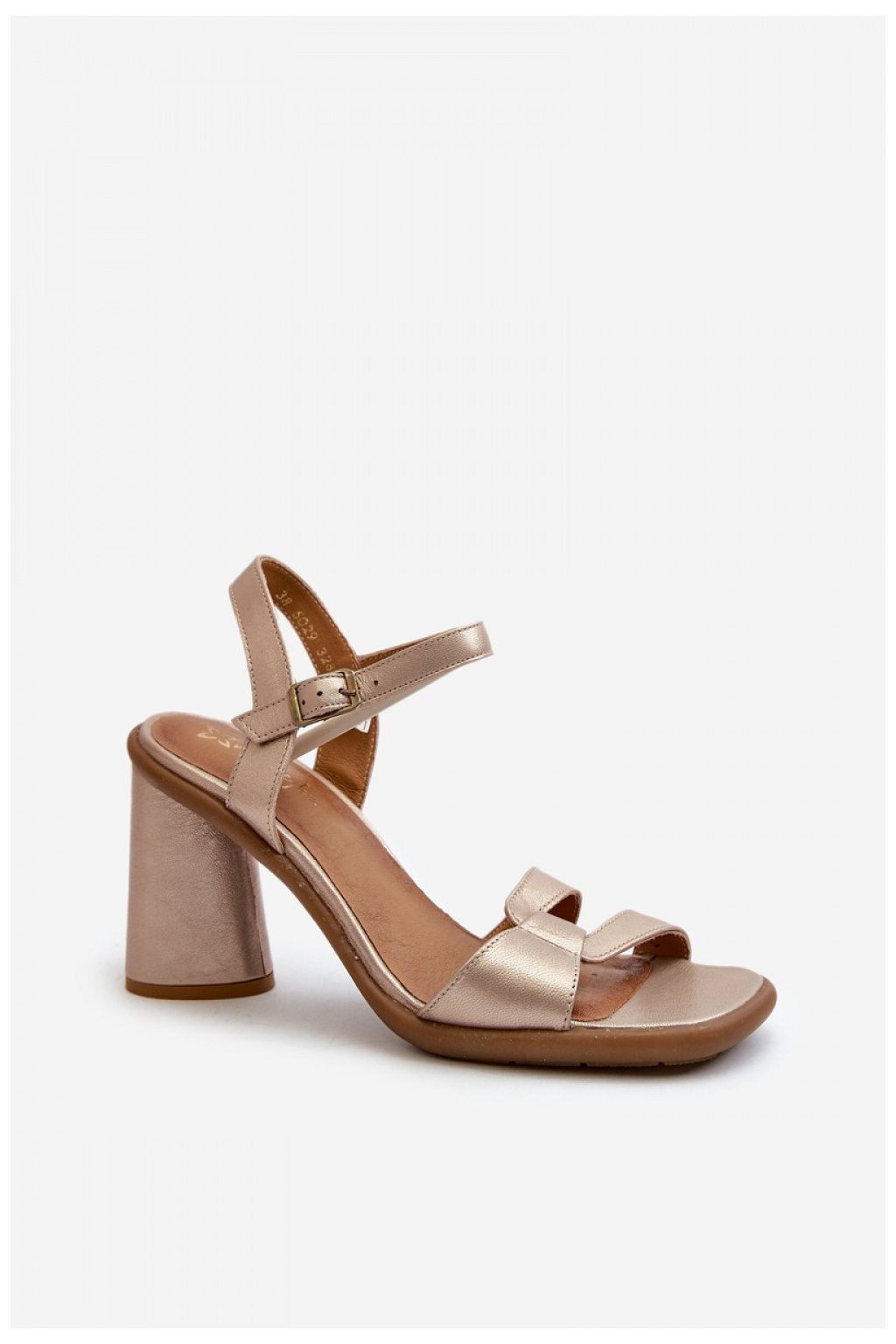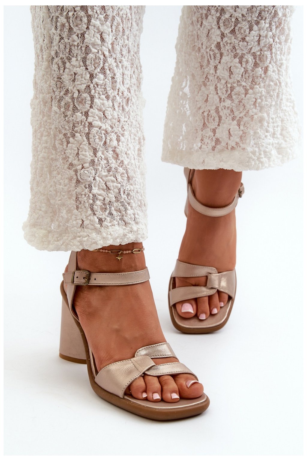 Módní dámské sandály byly vyrobeny z přírodní kůže. Tento model má měkkou stélku, která je při používání mimořádně pohodlná. Sandály jsou usazeny na podpatku ve tvaru trojúhelníkového sloupku. Zapínají se pomocí nastavitelného pásku s přezkou. Ideální obuv na nejrůznější oslavy nebo důležitá jednání v letních dnech!