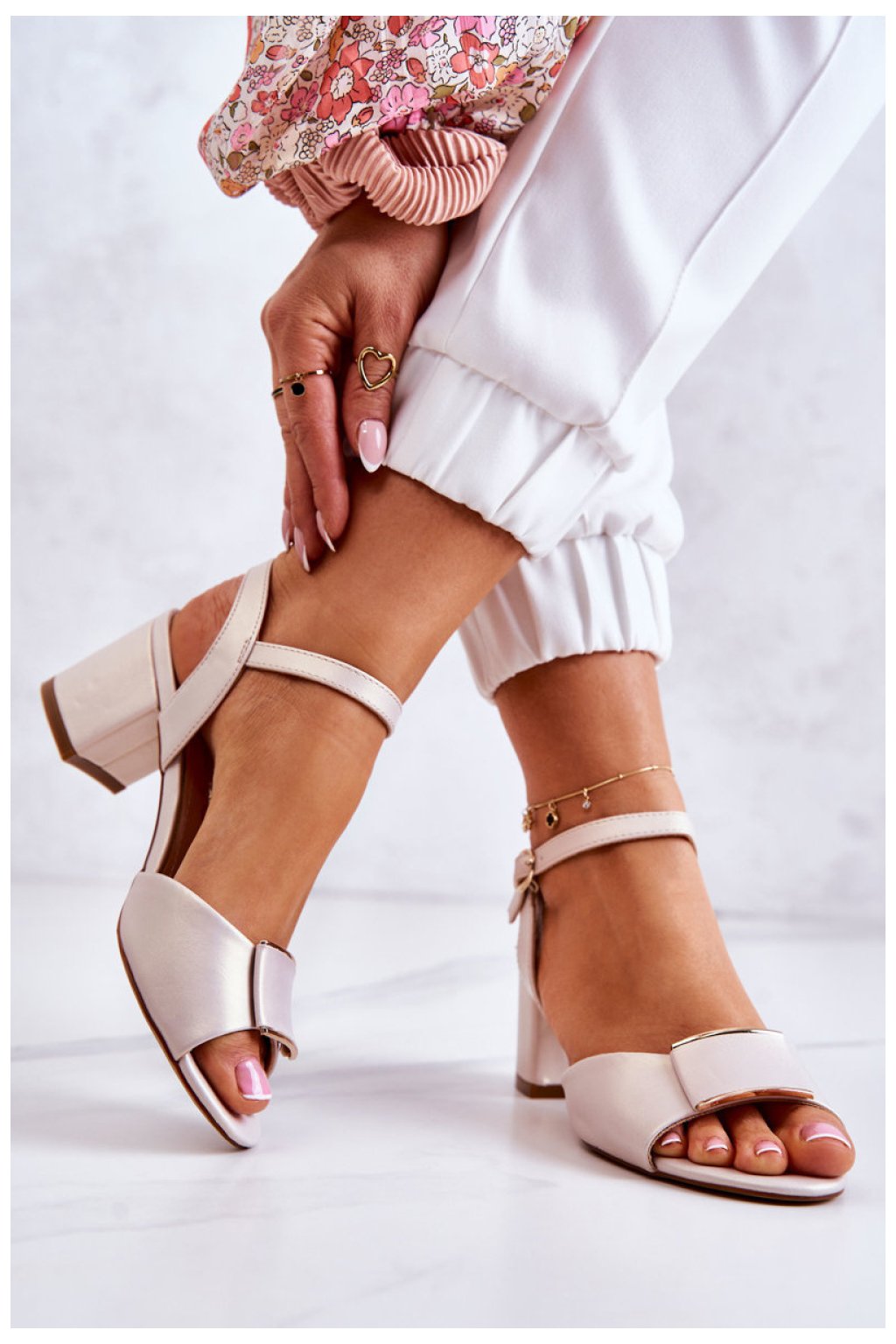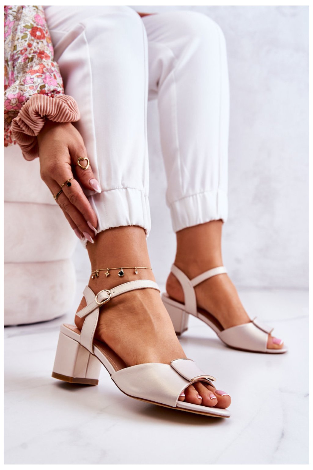 Sandály s tenkým, nastavitelným popruhem s malou kovovou přezkou. Na nízkém sloupcovém podpatku. Vyrobené z ekologické kůže s krásnou ozdobou vpředu. Otevřená špička. Vybavené vložkou z přírodní kůže, která je velmi měkká a pohodlná. Můžete si je obout ke mnoha stylizacím - do práce, na obchodní schůzky nebo rande. Sladit je s vzorovaným šaty nebo širokými elegantními kalhoty.