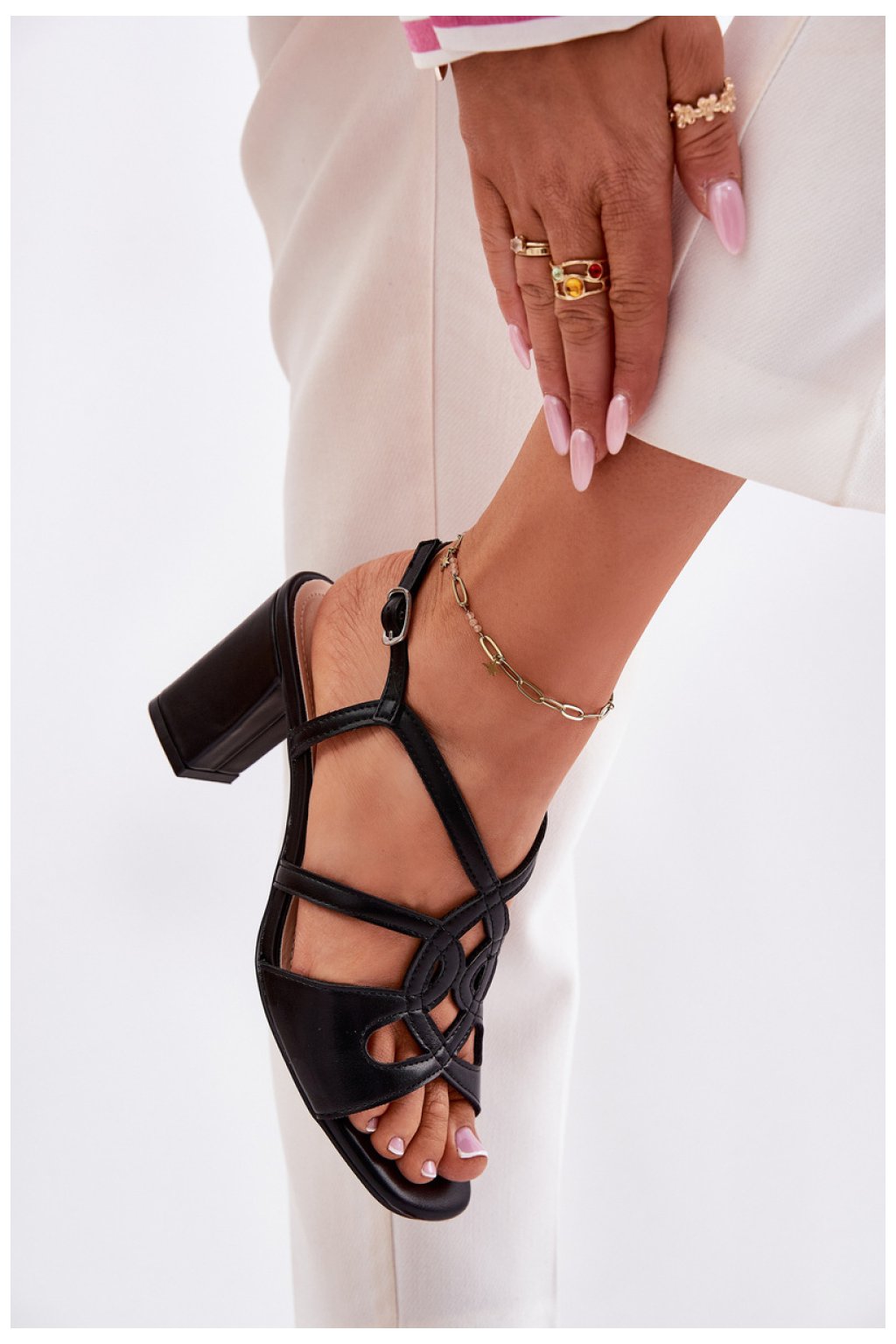 Dámské sandály vyrobené z ekokože jsou elegantní volbou na speciální příležitosti. Umístěné na sloupkovém podpatku poskytují stabilitu a pohodlí po celý den. Model se zapínáním na nastavitelný pásek s přezkou umožňuje ideální přizpůsobení noze. Kožená stélka zaručuje pohodlí a klasický design těchto sandálů je skvělou volbou pro elegantní stylizace.