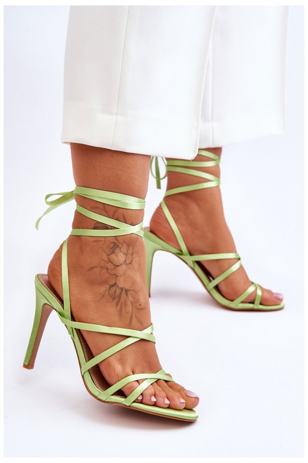 Tyto klasické dámské sandály byly vyrobeny z textilního materiálu. Stojí na jehlovém podpatku. Sandály mají měkkou stélku z ekokůže. Díky vzdušnému střihu jsou ideální pro horké dny. Sandály mají otevřený, mírně zaoblený nos. Tento model se zavazuje kolem lýtka.