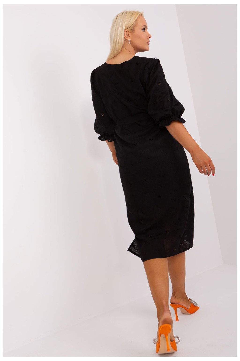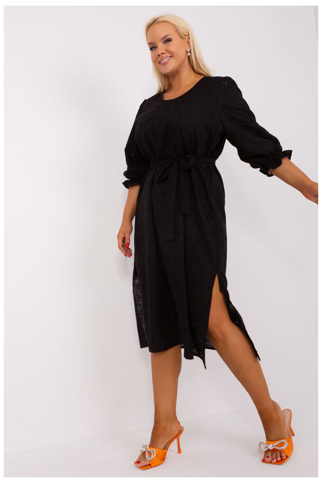 Bavlněné plus size šaty s 3/4 rukávy a kulatým výstřihem. Šaty mají podšívku, v pase se zavazují. Šaty jsou vyrobené z látky s výšivkou. Návrh pro mnoho příležitostí.