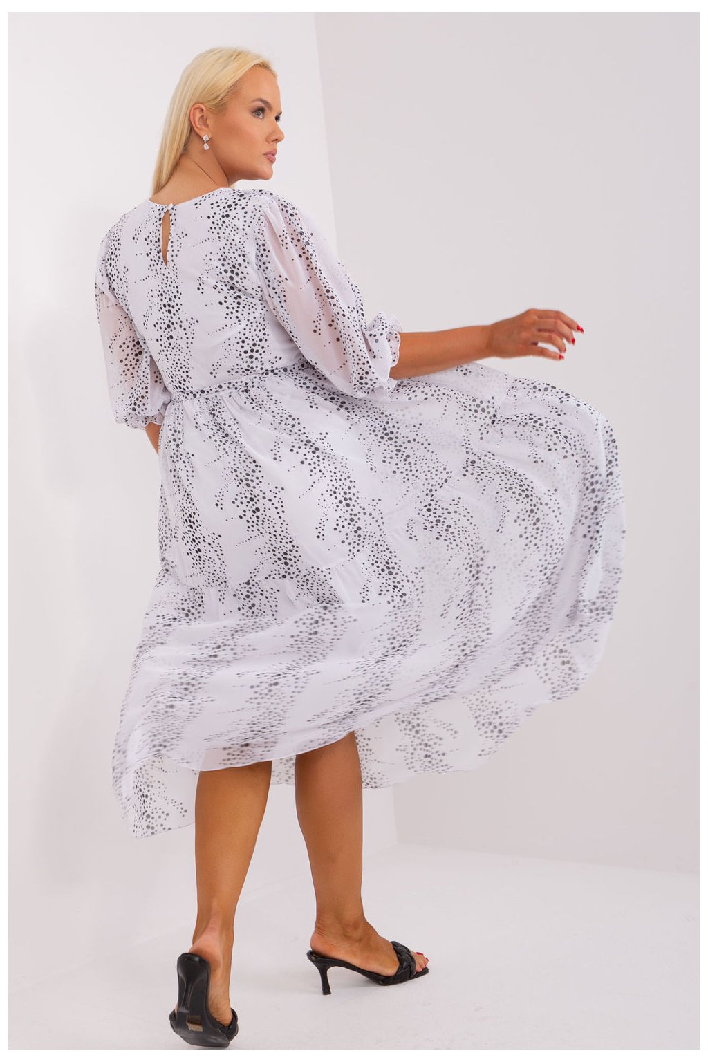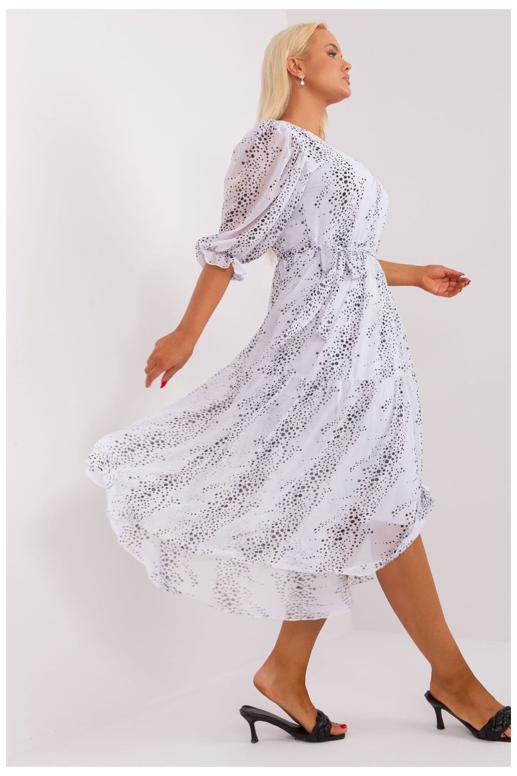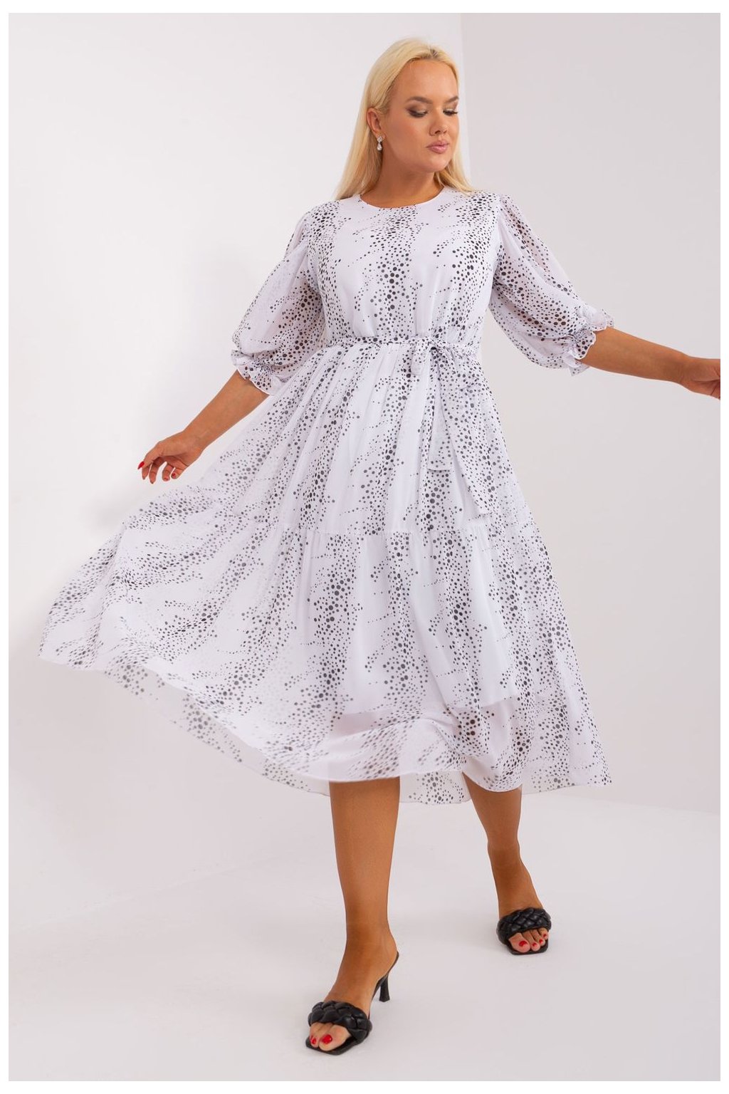 Šaty nadměrné velikosti s 3/4 rukávy a kulatým výstřihem. Šaty jsou podšité a v pase se zavazují. Návrh ideální pro mnoho příležitostí.