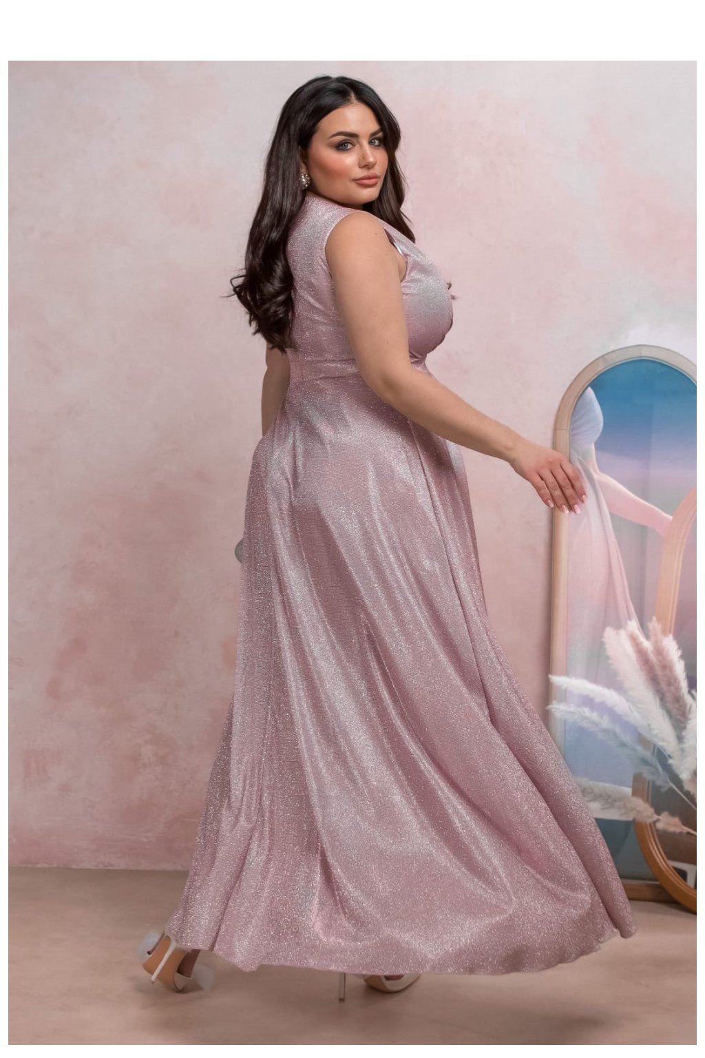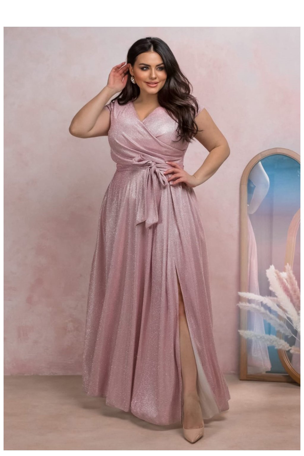 Elegantní, lesklé šaty v odstínu špinavé růže jsou skvělou volbou na speciální příležitosti. Vyrobené z jemně třpytivého materiálu dodávají stylizaci jemný lesk a luxusní vzhled. Klopový výstřih ve tvaru písmene V krásně zdůrazňuje poprsí, a šněrování v pasu tvaruje postavu, zdůrazňující její přednosti. Rozkvetlý spodek s efektním rozparkem dodává šatům lehkost a smyslnost. Model se zapíná na skrytý zip, co zajišťuje pohodlí nošení a dokonalé přizpůsobení postavě. Ideální na svatby, plesy, večírky a jiné slavnostní události.