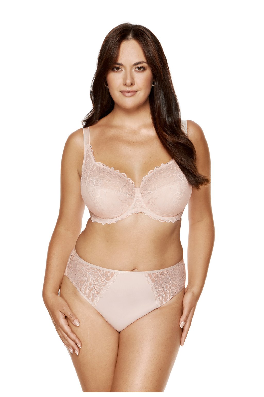 Podprsenka s polovinově usazenými košíčky v barvě béžové. Dolní část misek je vyrobena z tenké pěny s korálkem lemovaným korálky, zatímco horní část je vyrobena z korálku, díky čemuž se podprsenka dokonale přizpůsobuje tvaru prsou. Dolní část misek je vybavena vnitřní bavlnou šetrnou k pokožce s certifikátem OEKO-TEX. Svislé boční kostice stabilizují obvod podprsenky. Zadní část podprsenky je vyrobena z posíleného tilu. Podprsenka byla navržena a ušita v Polsku.