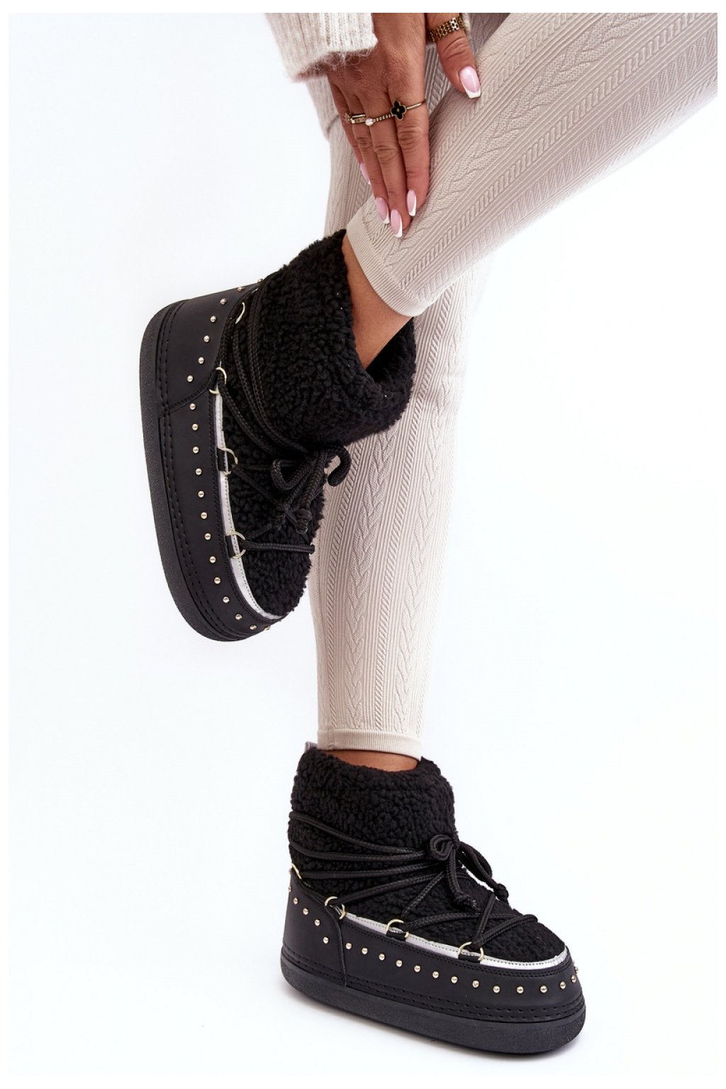 Jedinečné dámské sněhule jsou vyrobeny z materiálu odolného proti chladu a větru. Svršek s umělou ovčí kůží a cvočky bude ideální pro podzimně-zimní období. Klasický nazouvací model s přídavným šněrováním. Sněhule byly usazeny na masivní platformě. Uvnitř mají izolaci v podobě pěny a deky na boty, která poskytuje vysokou ochranu v chladných dnech.