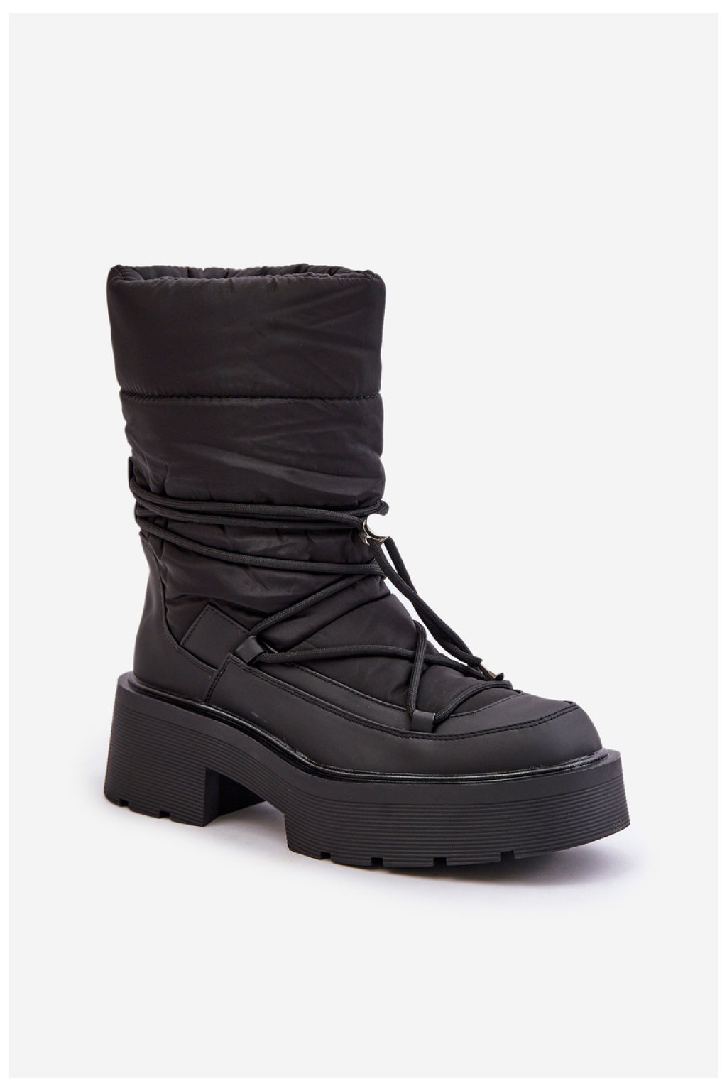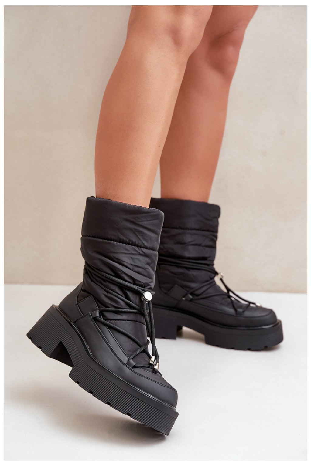 Sněhule jsou ideální boty na chladné a větrné dny. Vyrobeno z kombinace textilního materiálu a ekokože. Tento model je umístěn na masivní platformě a plochém podpatku se žlábky. Peta je zpevněna. Uvnitř je vyztužen kožichovým obkladem. Skvělý model pro každého mrzlého člověka!
