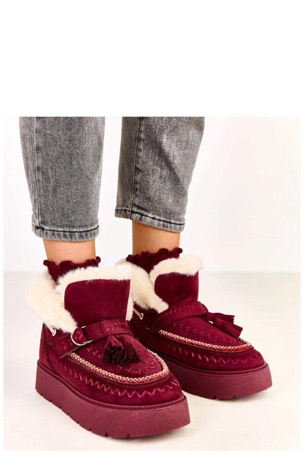 Zavinovací sněhule s ozdobnými řasami jsou kombinací pohodlí, tepla a stylového vzhledu ideální na zimní dny. Vyrobené z ekologické semišové kůže působí elegantně a zároveň jsou odolné proti každodennímu používání. Model má kulatou špičku a je vyztužený kožešinou, díky čemuž poskytuje tepelný komfort i v nejchladnější dny. Stylové ozdobné řasy přidávají botám charakter a lehkost, dávají jim módní, ležérní vzhled. Platforma o výšce 4 cm stabilizuje postavu, a vložka z umělého kožichu zaručuje dodatečné teplo a měkkost. Díky zavinovací konstrukci jsou boty pohodlné a rychlé na obouvání, ideální do každodenních, zimních stylizací.