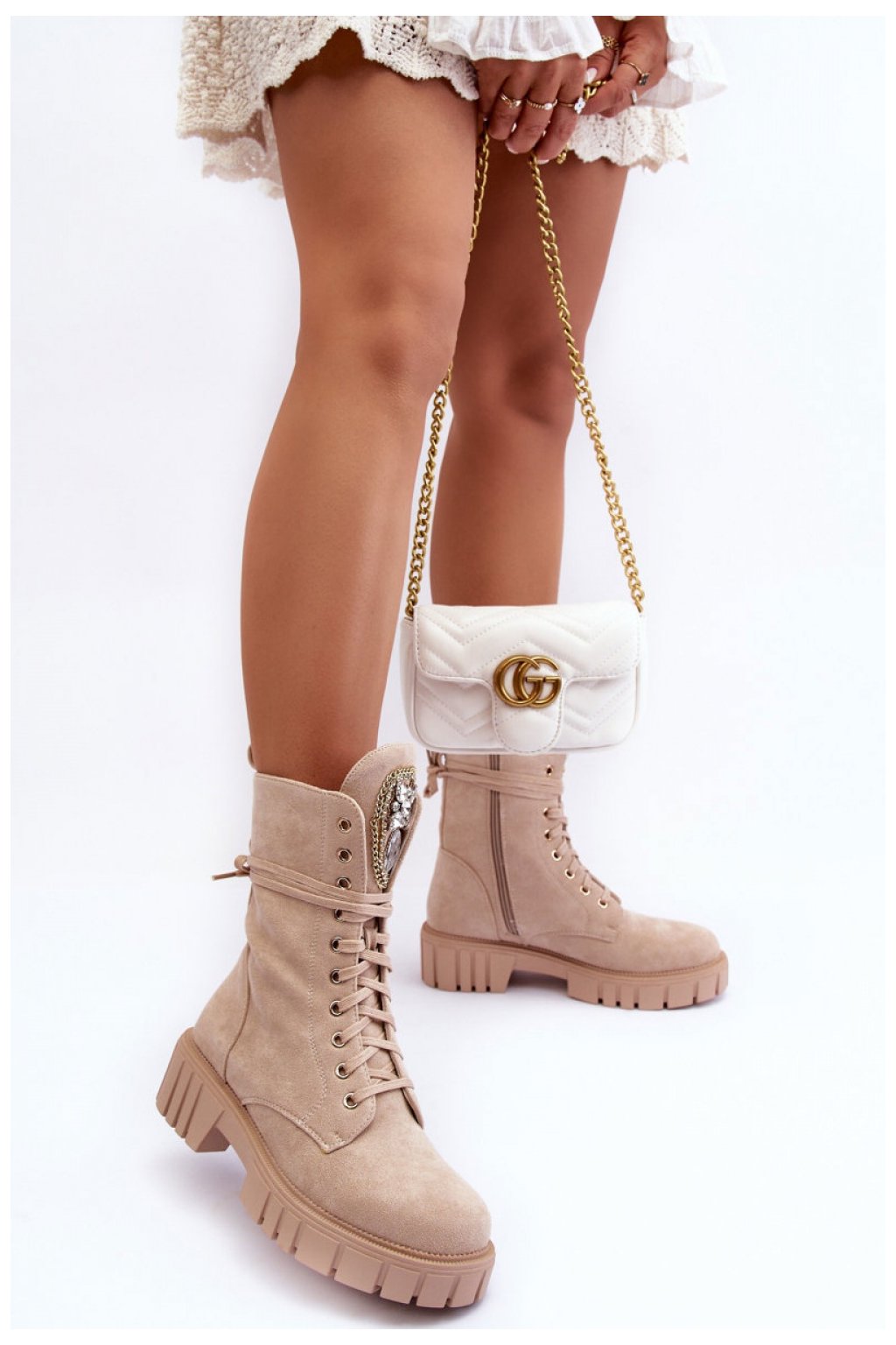 Dámské boty z ekologického semiše a zateplené přikrývkou na boty. Svršek za kotníkem. Šněrování vpředu a další zip na boku svršku. Osazení na plochém podpatku a platformě. Šperková ozdoba na jazyku. Jsou to skvělé boty na podzim a zimu! Budou se hodit k mnoha outfitům.