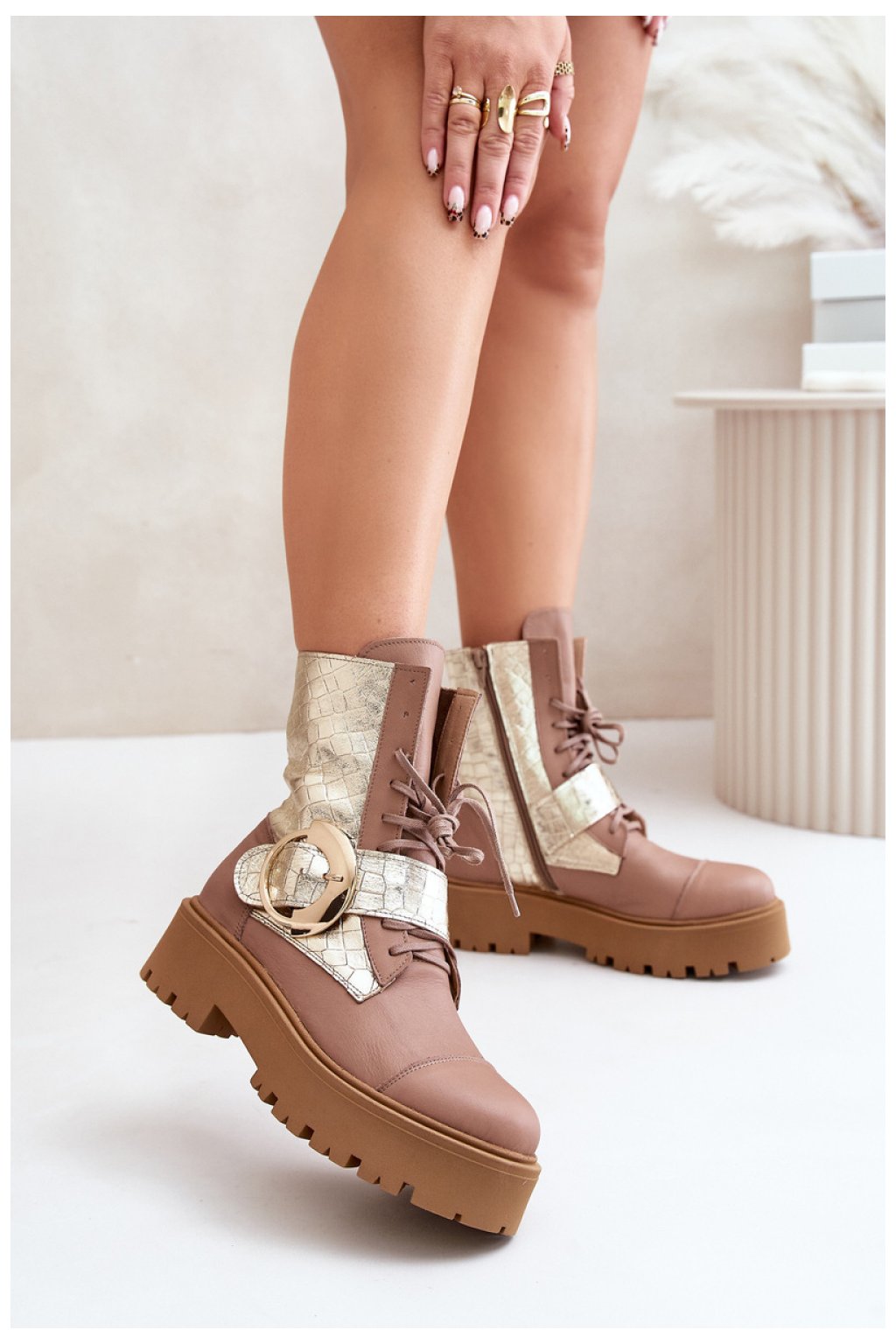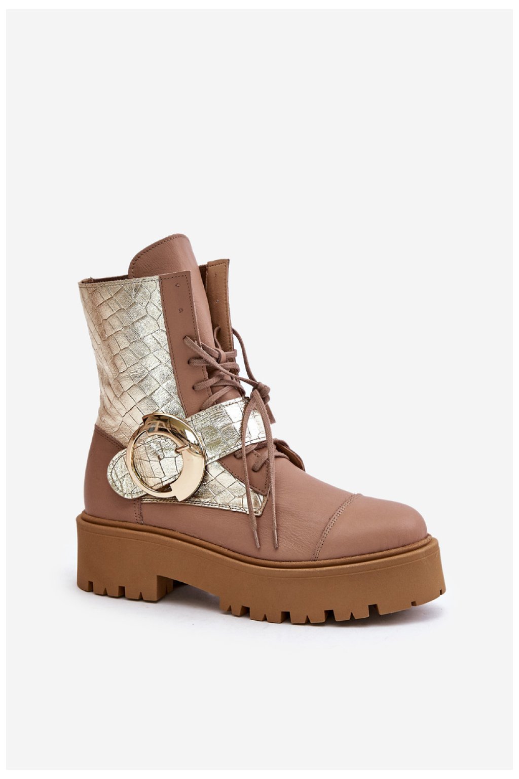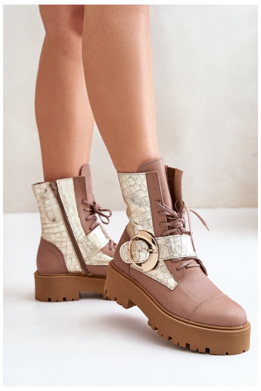 Výjimečné boty z přírodní kůže. Stojí na platformě a plochém podpatku a zajišťují stabilitu a pohodlné nošení. Model na zip je navíc vybaven šněrováním pro lepší přizpůsobení. Velká přezka s páskem na svršku je výrazným detailem, který jim dodává módní, osobitý charakter.