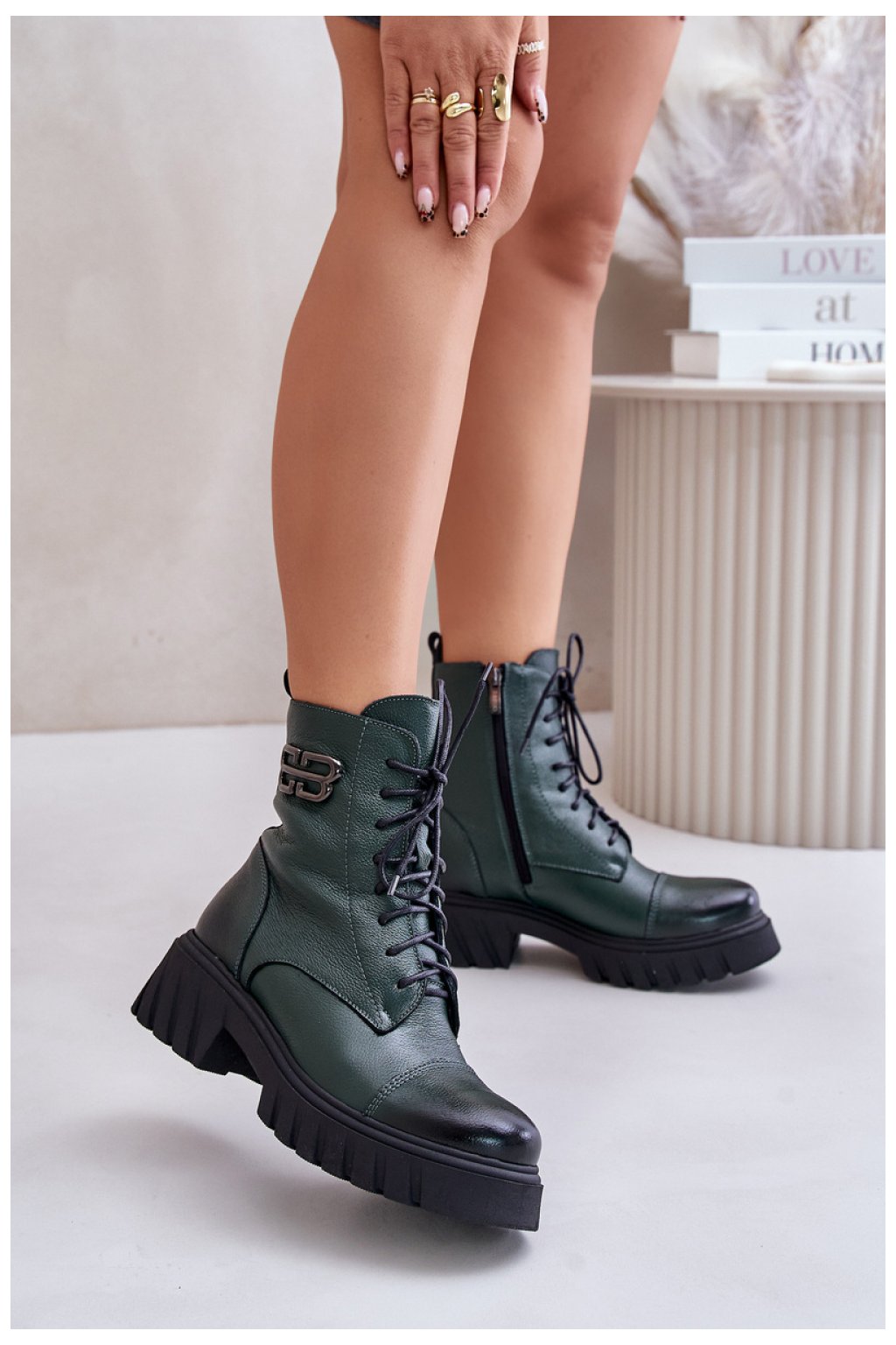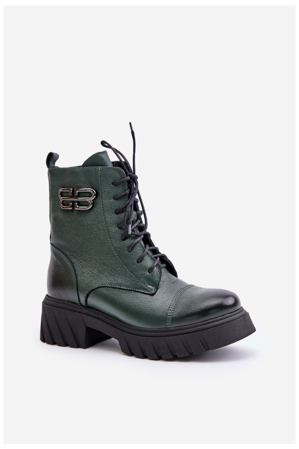 Dámské boty z přírodní kůže. Stojí na masivním plochém podpatku a platformě. Vybaveny šněrováním i zipem pro pohodlné nošení a přiléhání k noze. Ozdobný zlatý detail na boku svršku dodává eleganci. Vnitřní prostor zateplený přikrývkou na boty. Tyto boty, ideální pro podzimní a zimní stylizaci, spojují eleganci s funkčností.