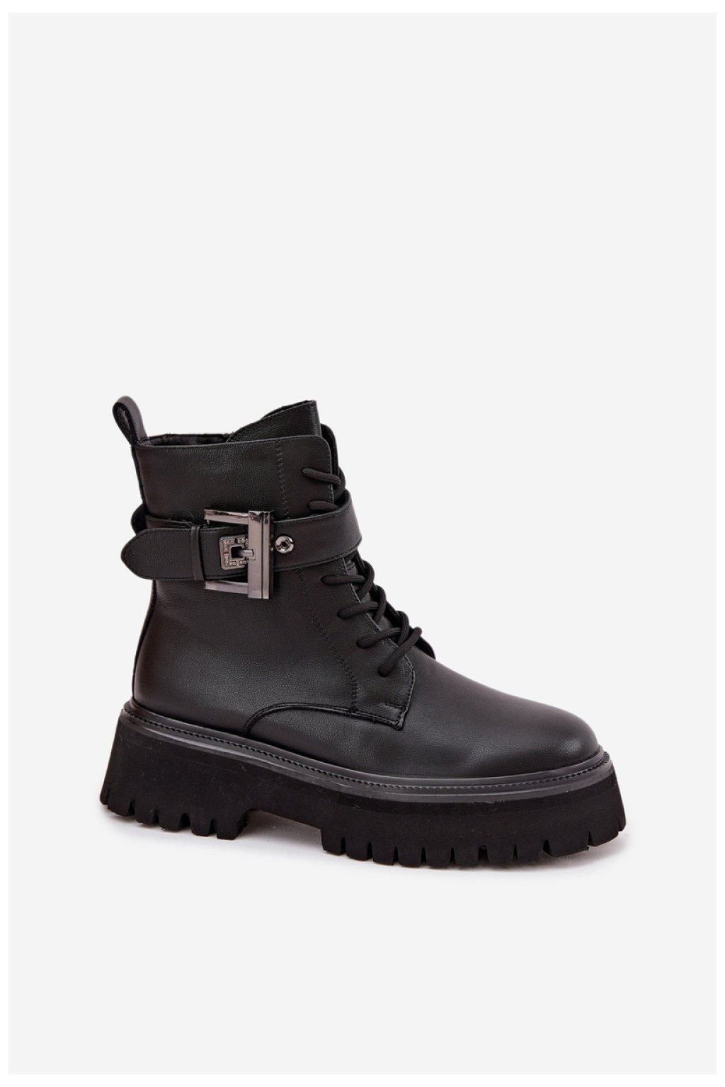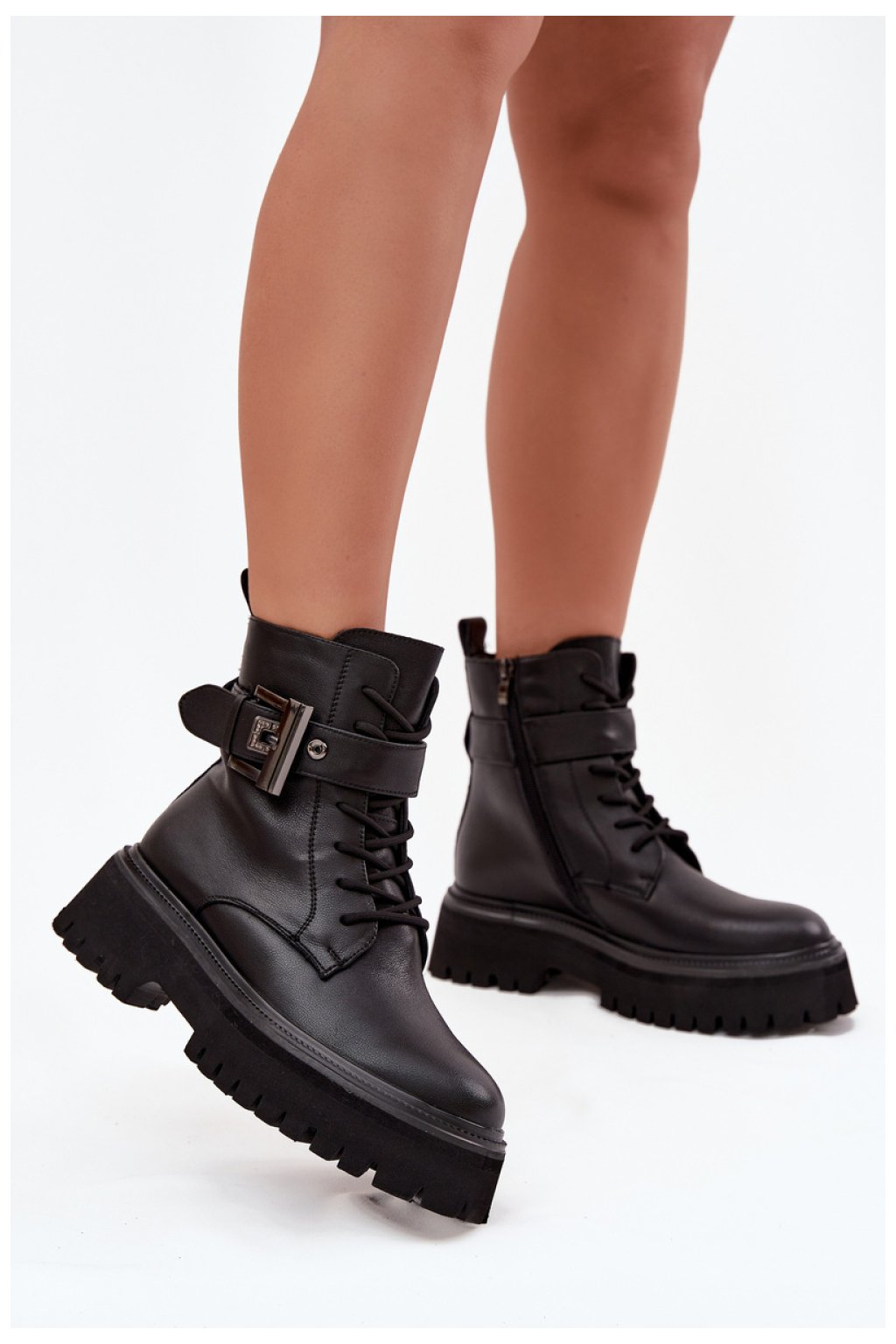 Botky workery pro ženy vyrobené z přírodní kůže. Model osazený na platformě poskytuje stabilitu a pohodlí při nošení. Boty jsou šněrovací a zapínají se na zip, díky čemuž se perfektně přizpůsobují noze a snadno se obouvají. Vnitřek je vyztužen, což zaručuje pohodlí a teplo v chladnějších dnech. Dekorativní pásek s přezkou jim dodává charakter a módní, lehce rockový styl. Jsou to skvělá volba pro každodenní stylizace.