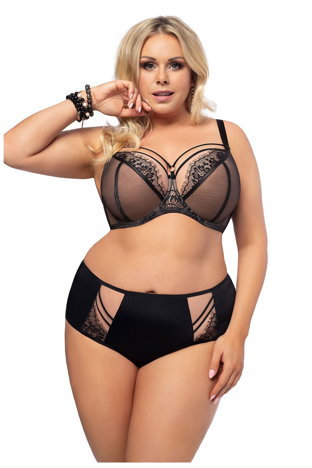 Sexuální a velmi pohodlná měkká podprsenka. Vyrobeno z dvojitě skládaného tylu: nahoře černý, dole béžový. Horní část košíčků této podprsenky je vyrobena z béžového tylu a krásné, jemné krajky a zakončena hladkým elastickým páskem. Střed podprsenky, který přesně přiléhá k mostu, je zdoben mašlí. Nad šálky dekorace v podobě jemných proužků. Použité suroviny a konstrukce zajišťují, že poprsí je dokonale shromážděno ze stran a drží na správném místě. Košíčky jsou tvarované drátkem kolem prsou. Díky tomu jsou prsa dokonale shrnutá dovnitř, zvednutá a udržují si krásný, zaoblený tvar.