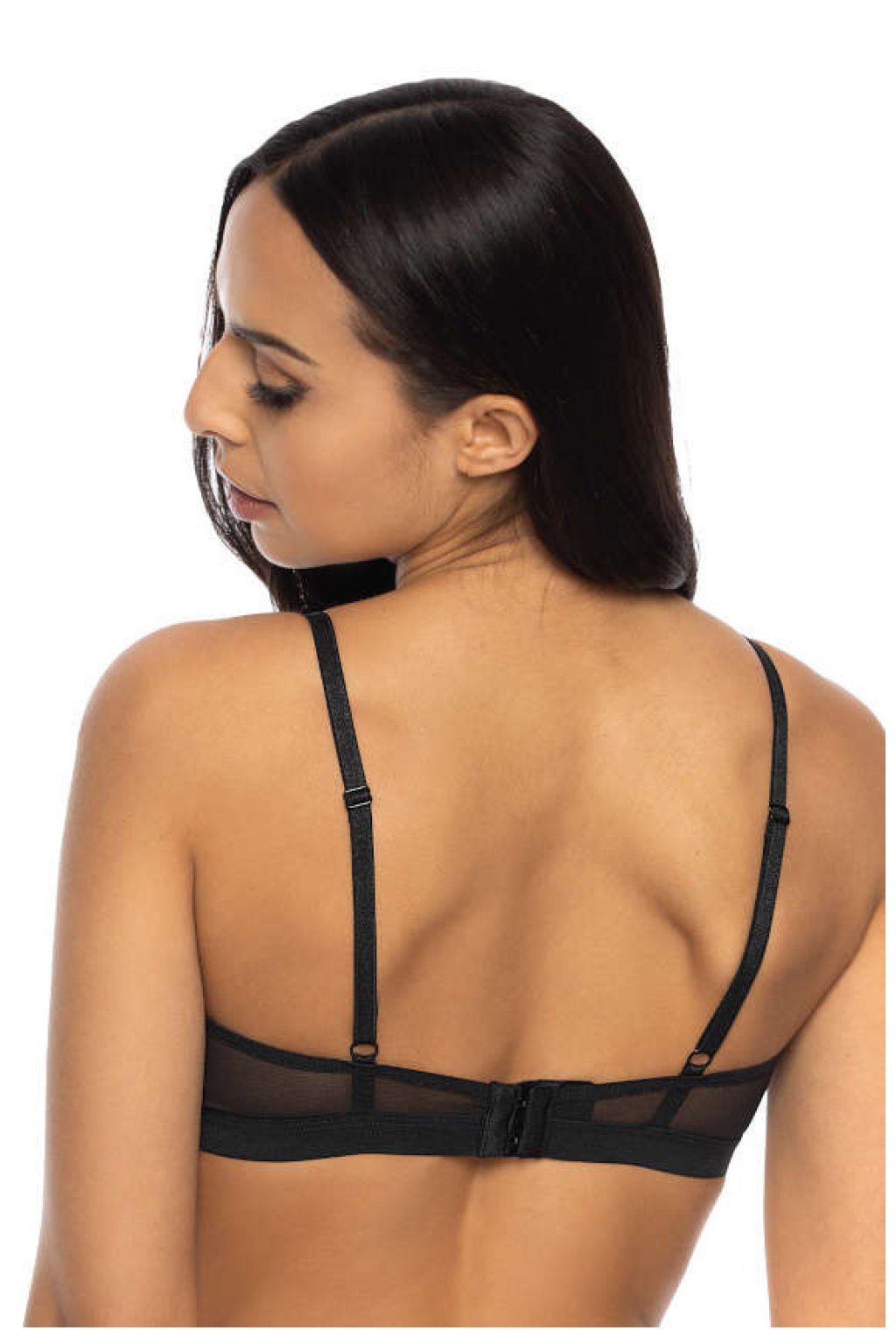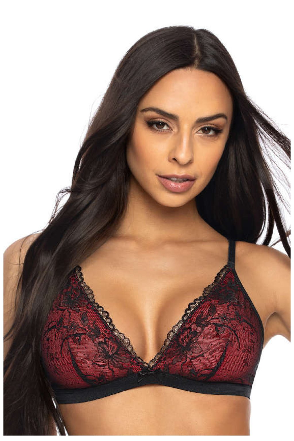 Model Percy - okouzlující měkká podprsenka typu bralette. Model nemá kostice. Trojúhelníkové košíčky jsou vyrobené z černé jemné krajky s květinovým motivem, podšité červeným elastickým tylem. Obvod je vyrobený z elastického pásku. Bez ramínek, nastavitelná ramínka. Košíčky zdobené mašličkou. Jednořadé zapínání na háčky a očka s třístupňovou regulací.