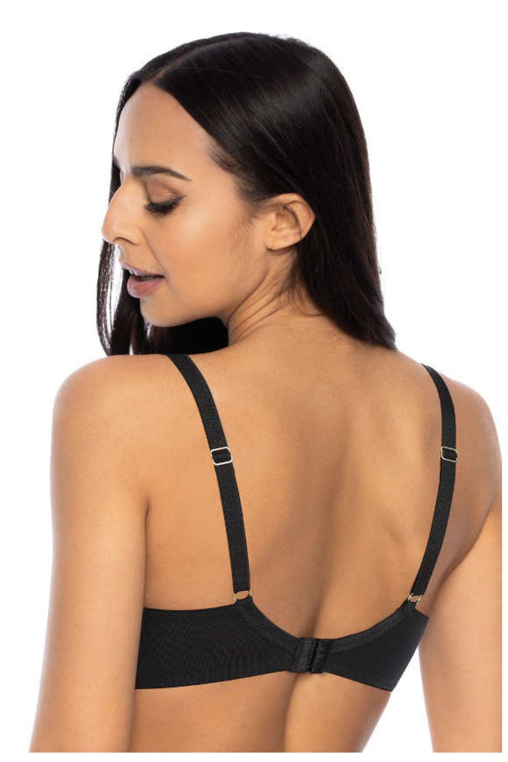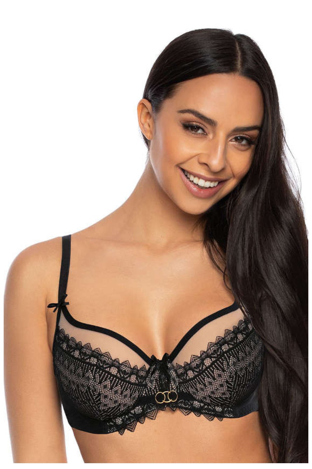 Elegantní a smyslná podprsenka Marion soft v černé a béžové barvě. Košíčky zdobí jemná černá krajka. Horní část košíčků je vyrobena z jemné elastické síťoviny, okraj je olemován měkkou bavlněnou páskou. Mezi košíčky mašlička a bižuterní akcent, na ramínkách ozdobné mašličky. Zadní díl z lycrové tkaniny, bez ramínek, nastavitelná ramínka. Dvouřadé nebo třířadé zapínání (v závislosti na velikosti) s třístupňovým nastavením.