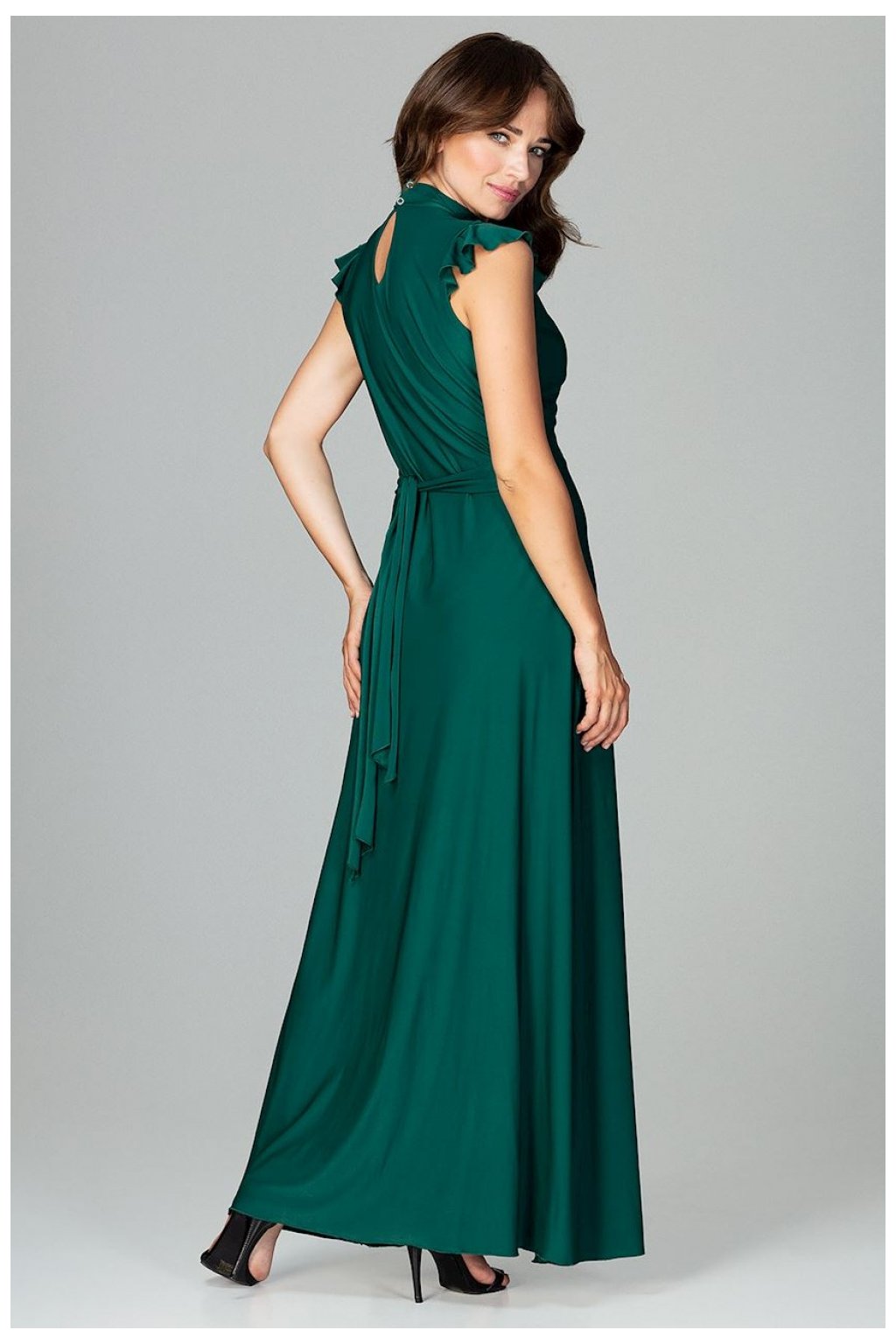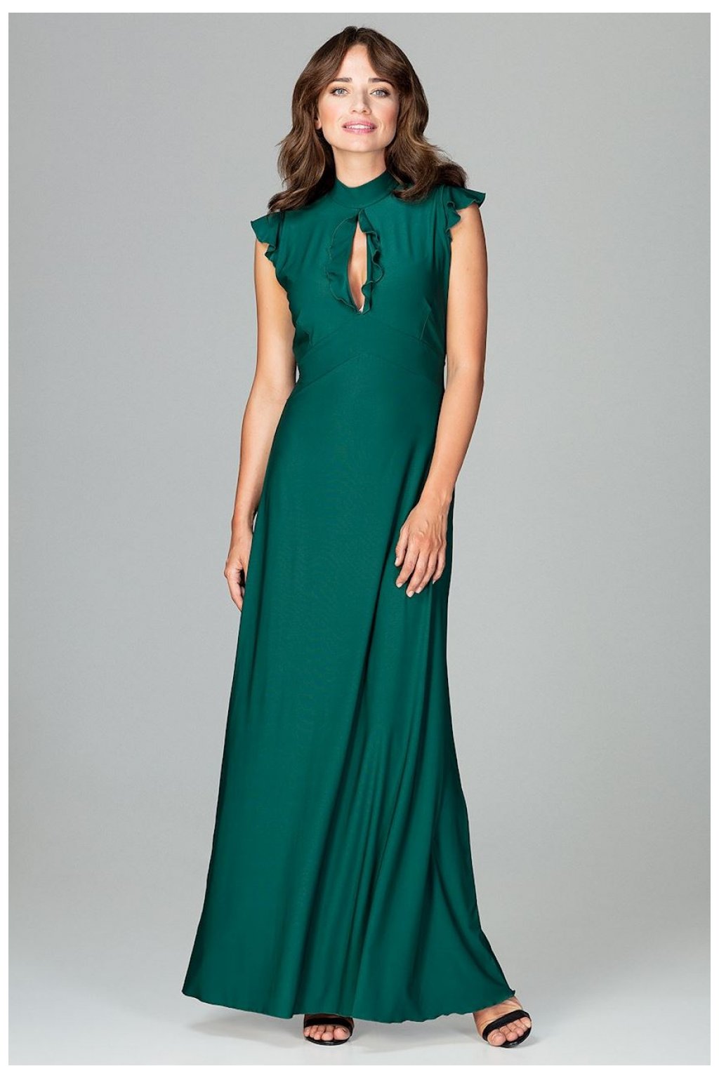 Nádherné maxi šaty, vypasované v pase a mírně rozšířené ve spodní části. Zdůrazňuje ženskost a eleganci. Ozdobné volánky na ramenou a ve výstřihu, zavazování na zádech a zapínání na knoflíky v horní části.