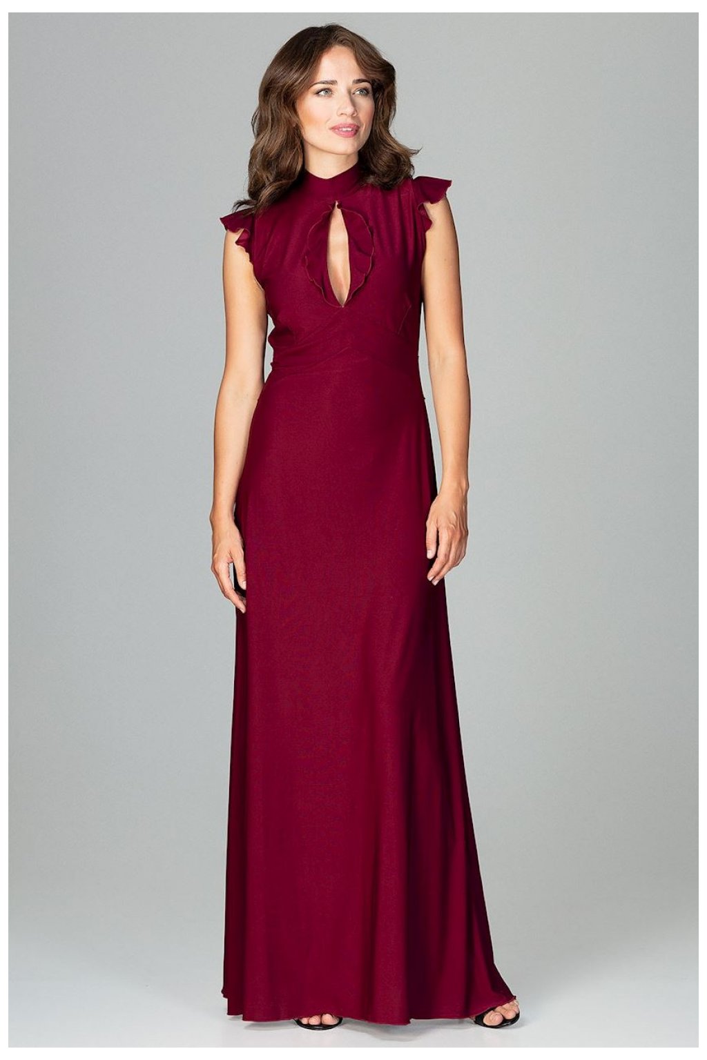 Nádherné maxi šaty, vypasované v pase a mírně rozšířené ve spodní části. Zdůrazňuje ženskost a eleganci. Ozdobné volánky na ramenou a ve výstřihu, zavazování na zádech a zapínání na knoflíky v horní části.