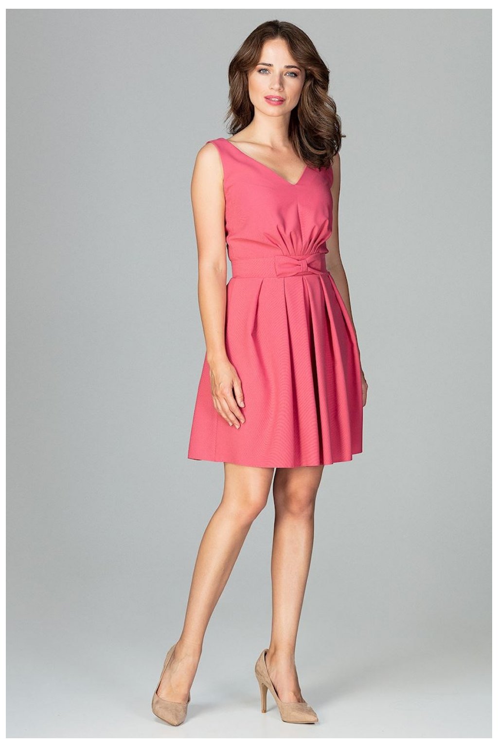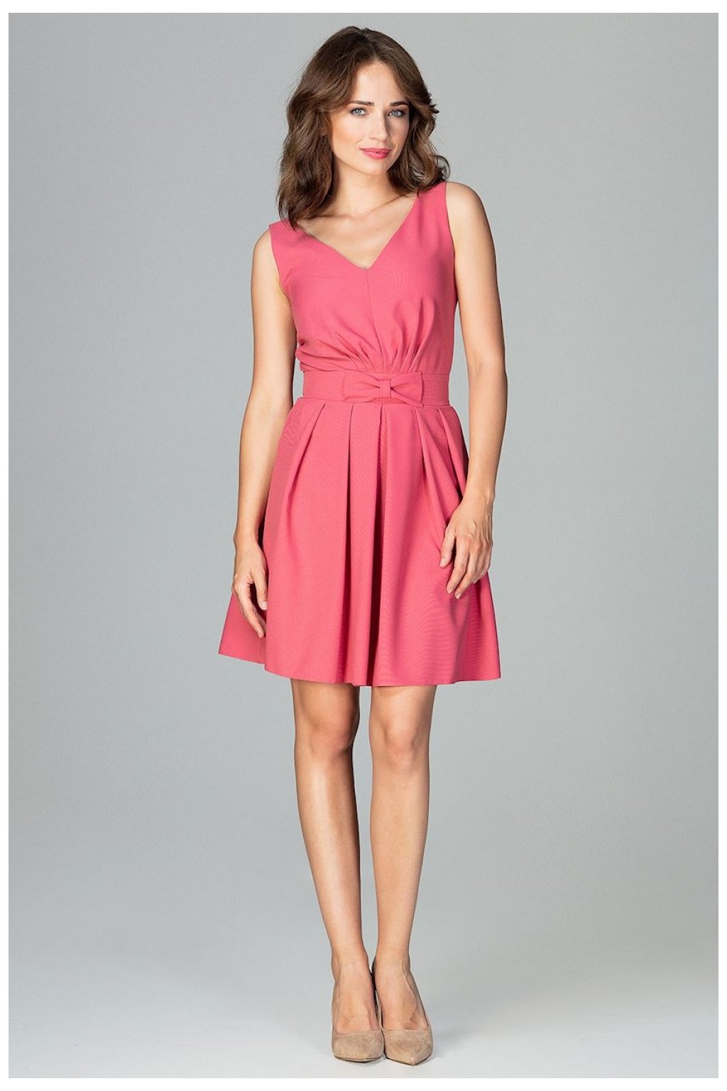Koktejlové šaty bez rukávů s malou mašlí v pase pro zvýraznění postavy. Model s jemným výstřihem, volánky ve spodní části a zapínáním na zip. Krásně odhalená záda působí čistě a žensky.