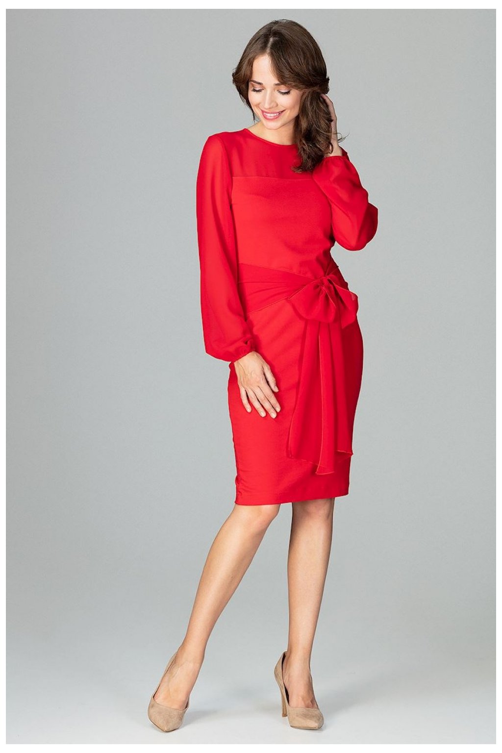 Elegantní šaty s dlouhými průhlednými rukávy. Krásná mašle v pase, kterou lze uvázat mnoha způsoby, a krytý zip na zádech. Model krásně zdůrazňuje ženskost a jemnost.