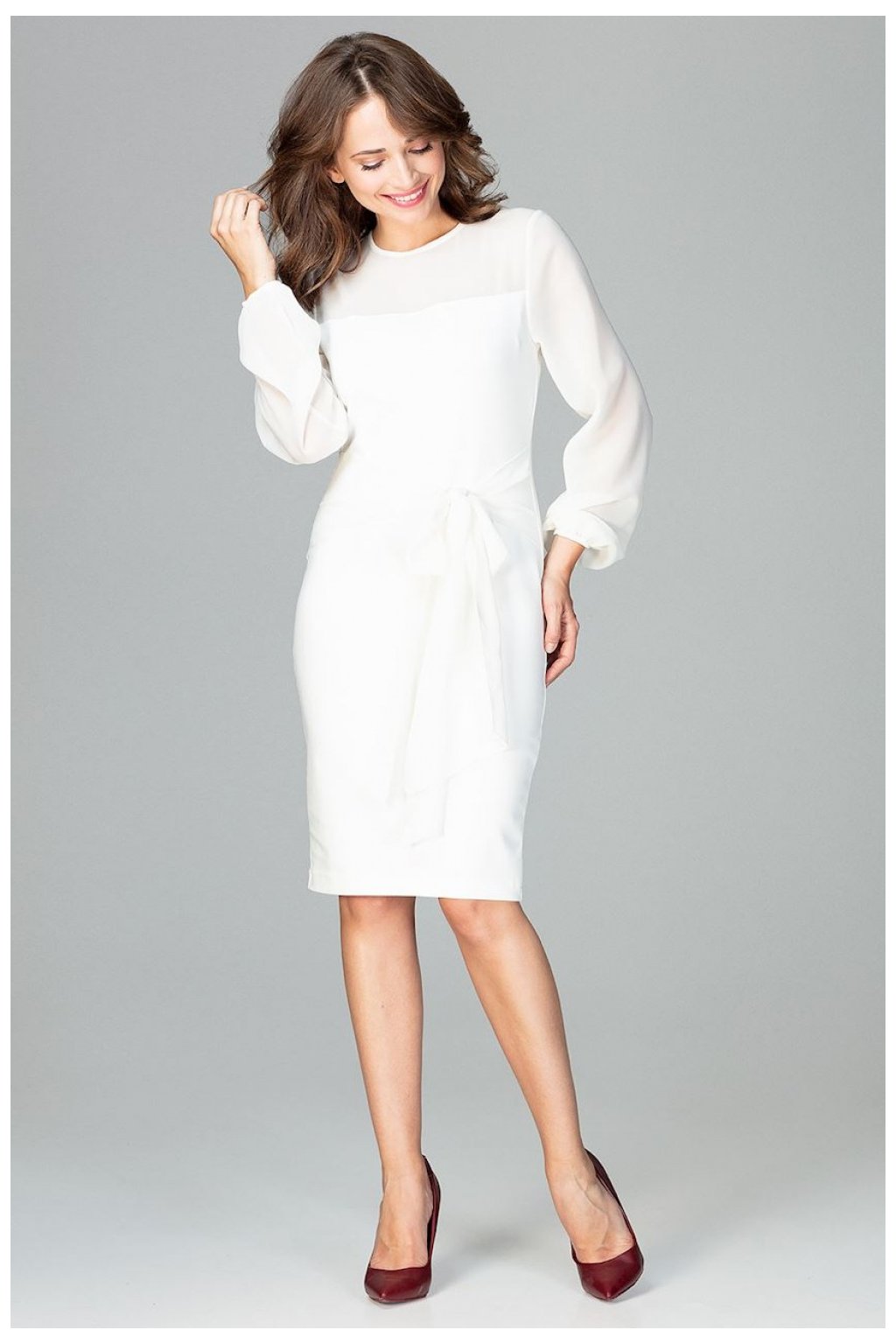 Elegantní šaty s dlouhými průhlednými rukávy. Krásná mašle v pase, kterou lze uvázat mnoha způsoby, a krytý zip na zádech. Model krásně zdůrazňuje ženskost a jemnost.