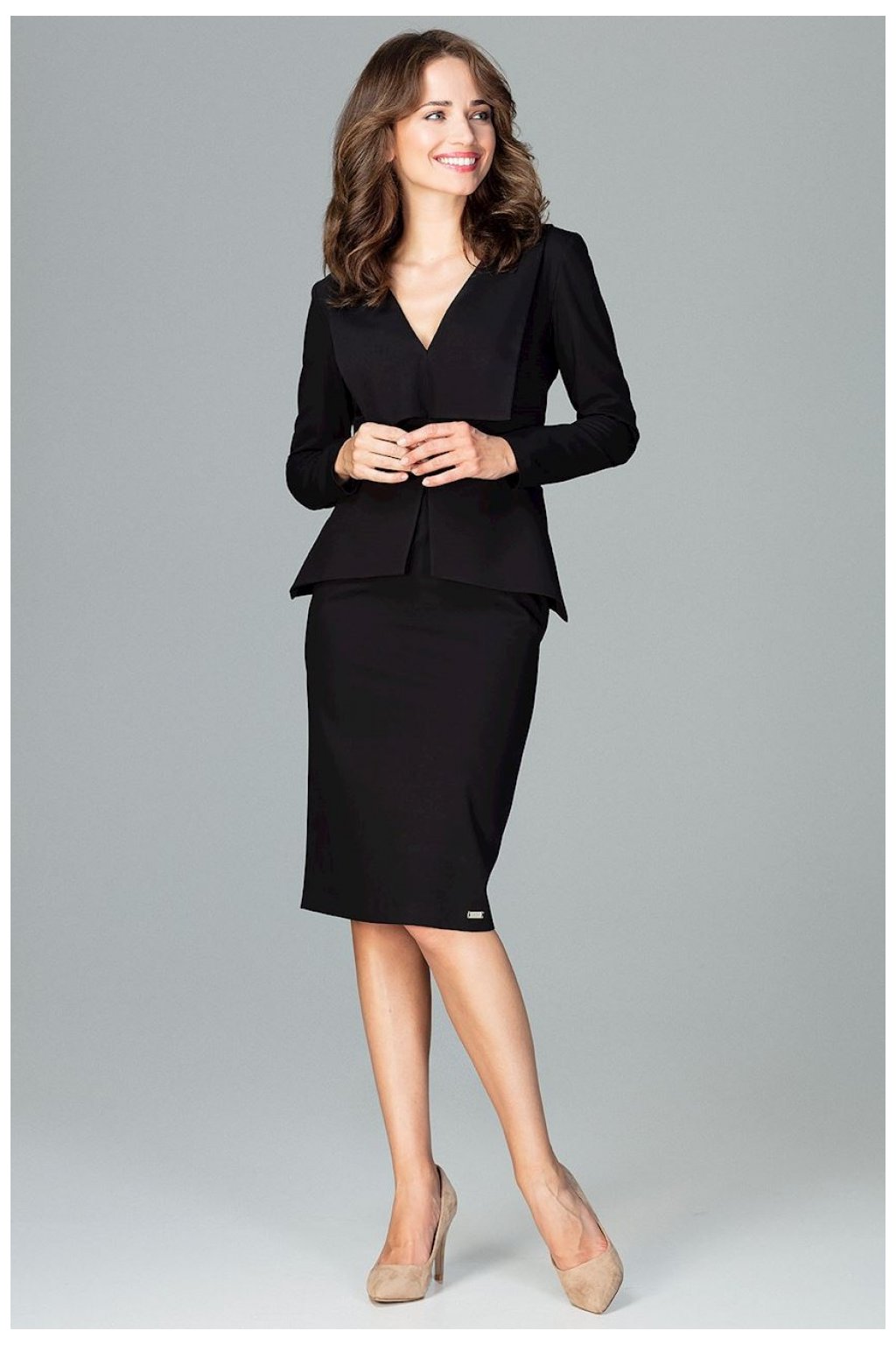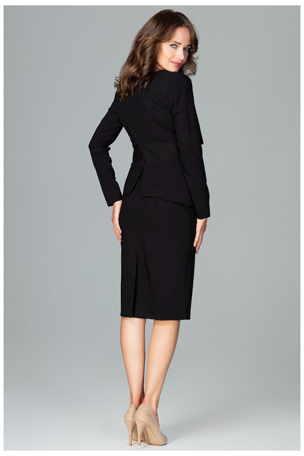 Šaty v délce ke kolenům s dlouhými rukávy a velkými lemovanými klopami ve výstřihu. Model má v pase geometrickou kostici s rozparkem na zádech pro větší pohodlí.