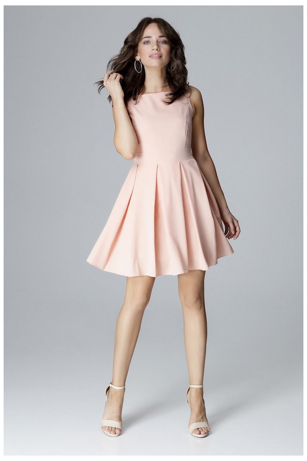 Šaty bez rukávů. S vypasovaným horním dílem a ženským, malým výstřihem. Model je v pase přestřižený a má rozšířenou, do širokých záhybů uspořádanou spodní část. Šaty dokonale zdůrazňují a zeštíhlují pas.