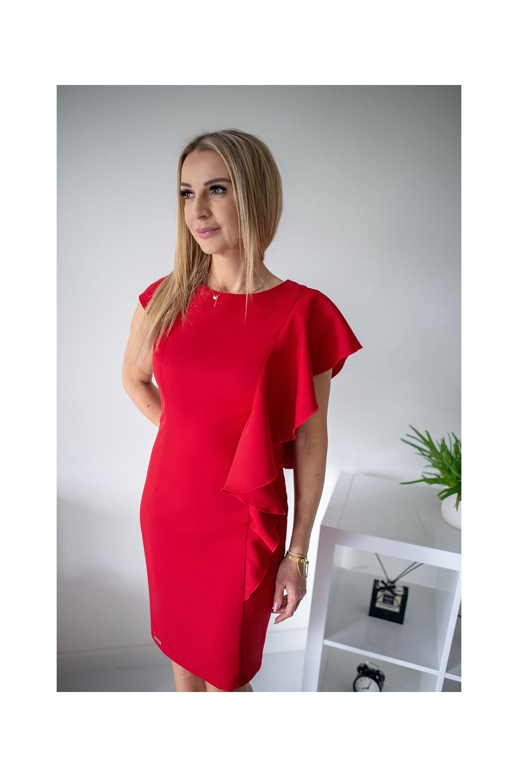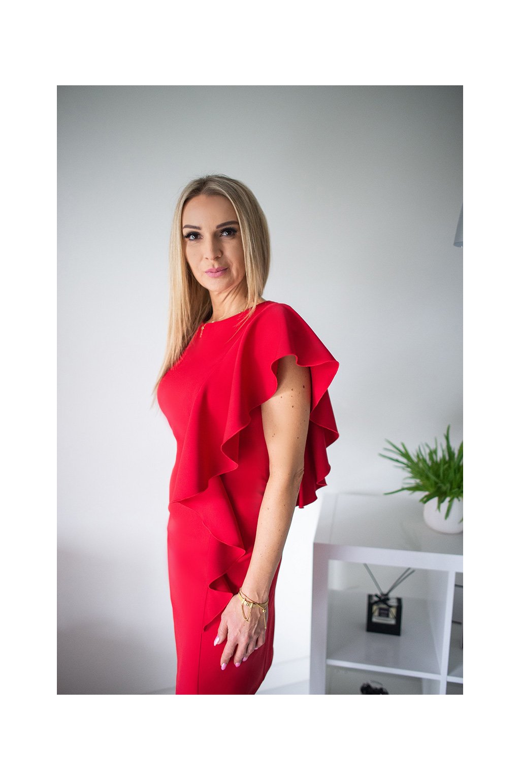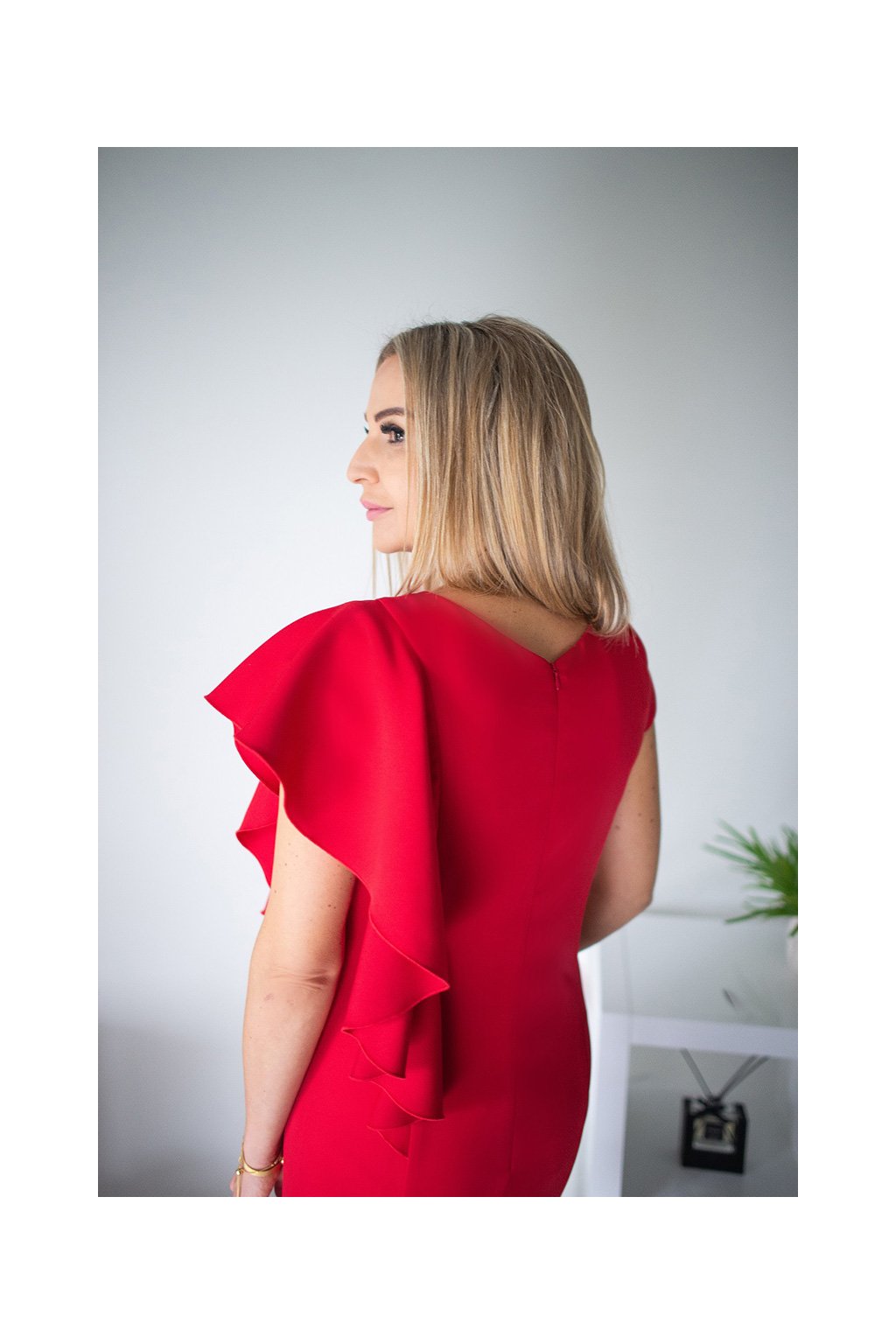Šaty v červené barvě s vypasovaným střihem. Šaty se zapínají na krytý zip. Šaty zdobí volánek po celé délce. Šaty jsou vyrobeny ze zlatého lesklého materiálu.