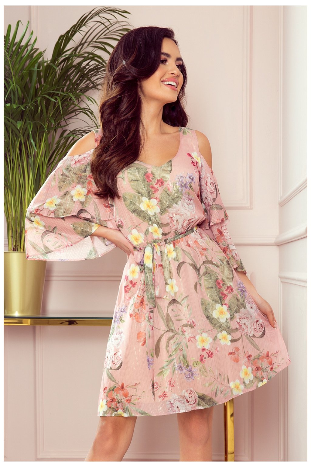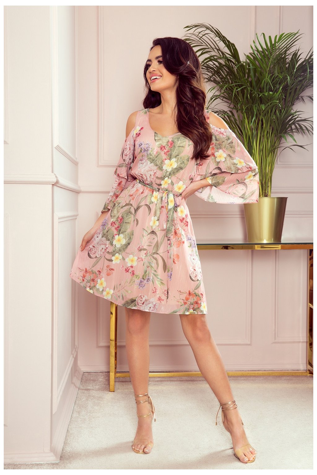 Vzdušné šifonové šaty s rozšířenými dvojitými rukávy, výstřihem a elastickým pasem. Šaty v pastelově růžové barvě se stříbrnou květinovou nití. Značka numoco. Vyrobeno v Polsku.