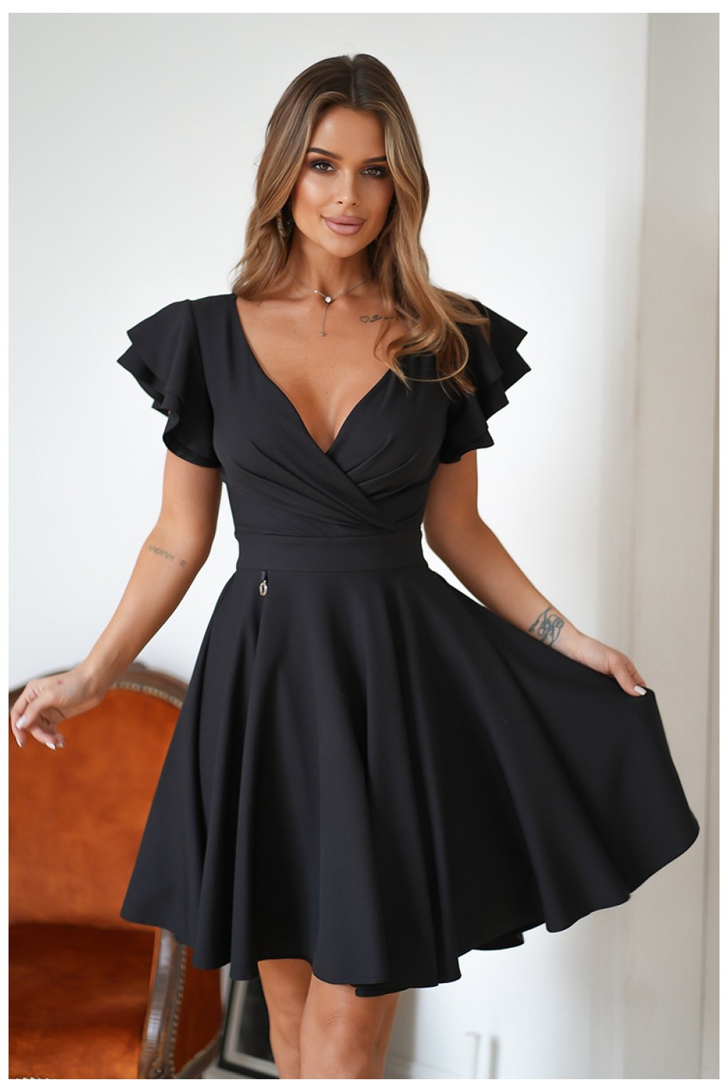 Dívčí model, mírně rozšířený, zakončený krásnými volánky na rukávech. Šaty se zapínají na krytý zip a mají podšívku. Velmi dobře střižená kreace, dokonale zvýrazňující pas.