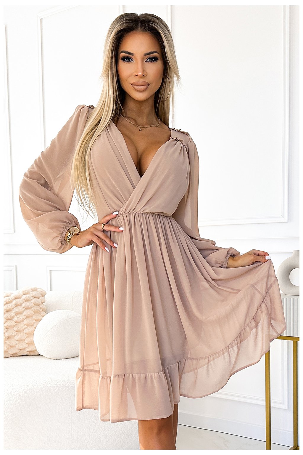 Šifonové midi šaty s dlouhými rukávy a elegantně zakončeným výstřihem. Šaty mají béžovou barvu. Celé šaty jsou pošité podšívkou. Značka numoco. Polská výroba.