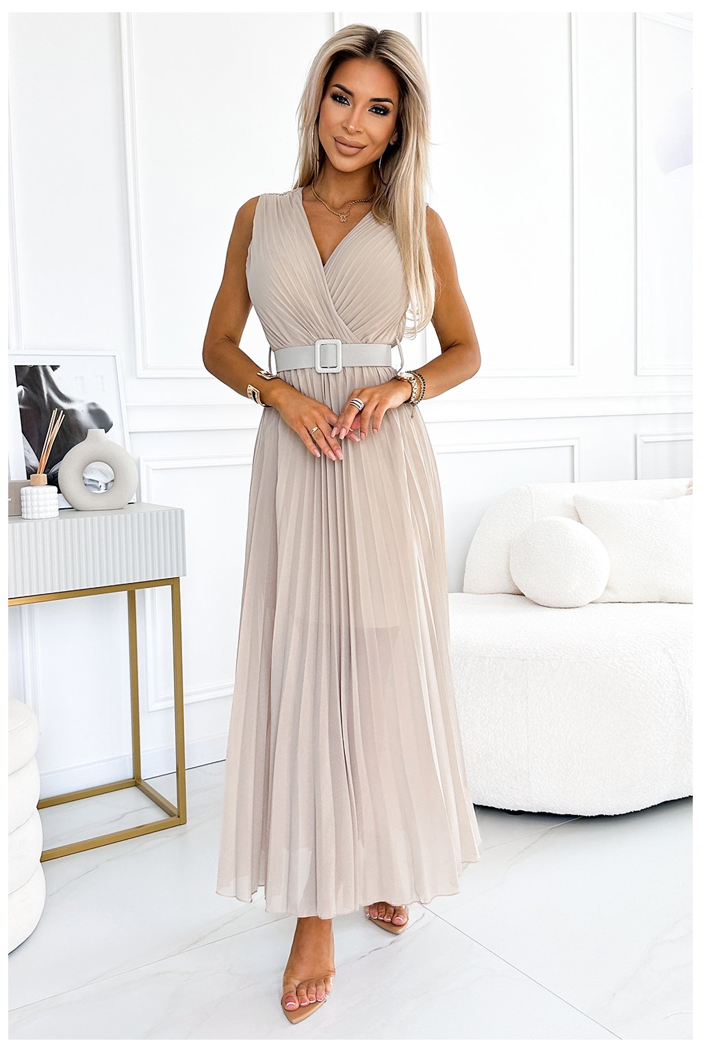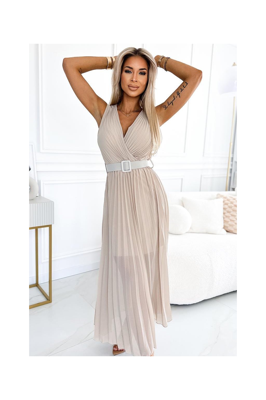 Plisované šifónové šaty s výstřihem a širokým páskem. Plisování na výstřihu a sukní přidává šatům eleganci. Šaty jsou béžové barvy a mají podšívku. Značka numoco basic.