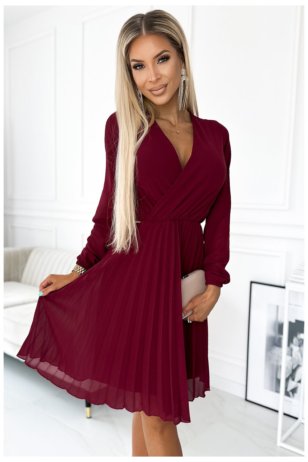 Plisované šifonové šaty s dlouhými rukávy a výstřihem. Šaty ve vínové barvě. Značka numoco. Polská výroba.