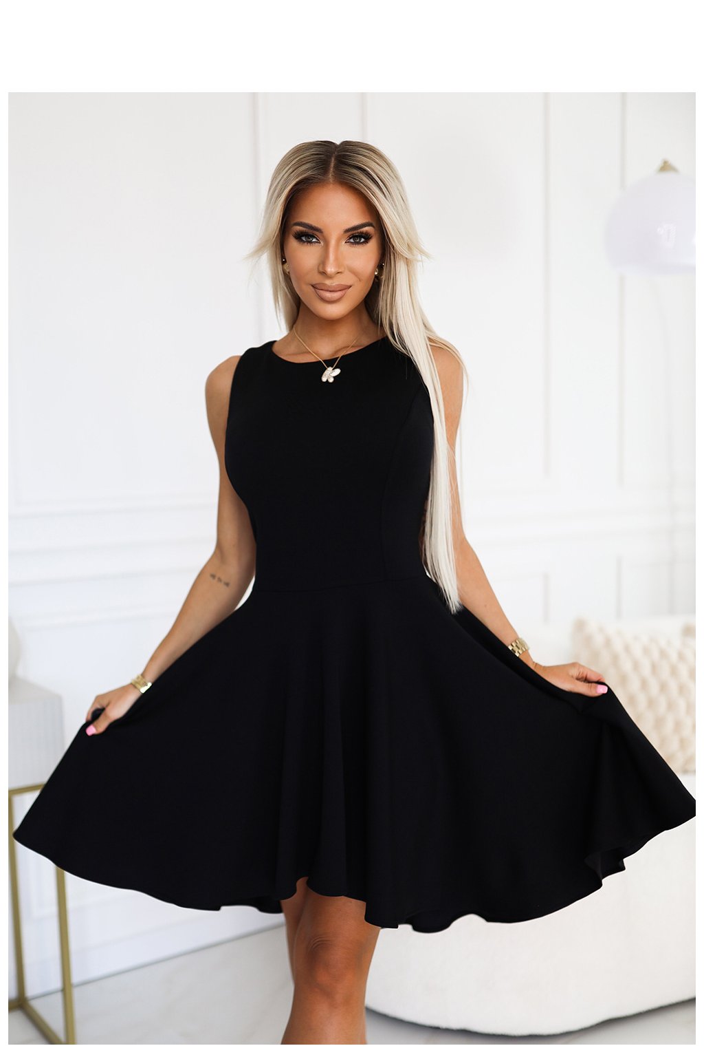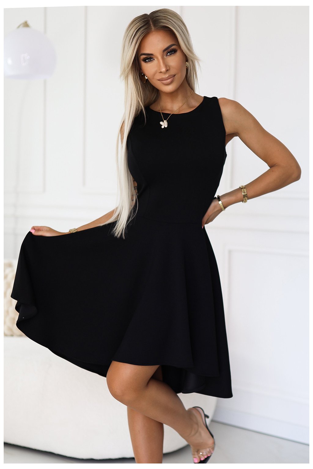 Elegantní černé šaty značky Numoco s delším zády jsou ideální volbou na speciální příležitosti. Vyrobené z elastického materiálu krásně podtrhují postavu a poskytují volnost pohybu, asymetrická sukně dodává lehkost a dynamiku, zejména při tanci. Šaty se zapínají na skrytý zip na zádech. Polský výrobek.