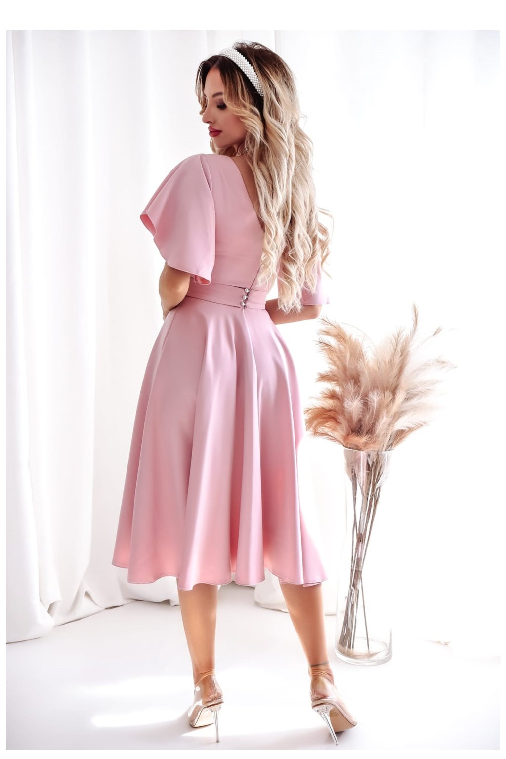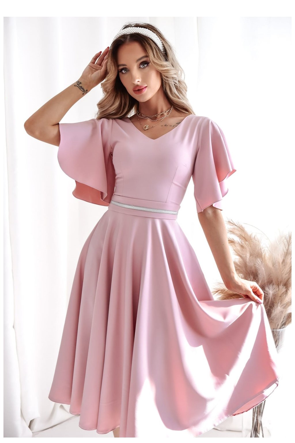 Elegantní šaty v odstínu špinavě růžové jsou ideální volbou na speciální příležitosti. Vyrobené z vysoké kvality materiálu, skvěle padnou na postavu, zdůrazňujíce její výhody. Model má výstřih ve tvaru písmene V, který jemně zdůrazňuje krk a klíčníky. Rukávy s volným, volánovým střihem dodávají šatům lehkost a romantický charakter. Pás zdobený lehkým ozdobením důkladně zdůrazňuje postavu. Rozkročený spodek dává kreaci lehkost a eleganci. Šaty se zapínají na skrytý zip, co zajišťuje pohodlí a ideální sedění. Skvělé na svatby, večírky, křtiny a další elegantní události.