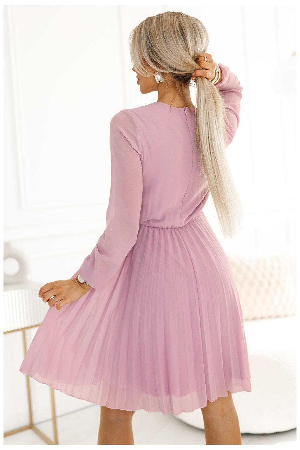 Jemný a mimořádně ženský plisovaný šaty vyrobené z lehkého, vzdušného šifonu. Jemně přiléhavý střih zdůrazňuje postavu a jemné plisy dodávají celku eleganci a lehkost. Dlouhý rukáv a klasický výstřih přidávají eleganci, vytvářejí nadčasový vzhled pro zvláštní příležitosti. Šaty v odstínu pudrové růže okouzlují svou jemností a romantickým charakterem. Polský výrobek. Značka Numoco.