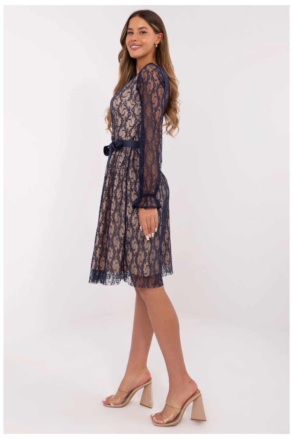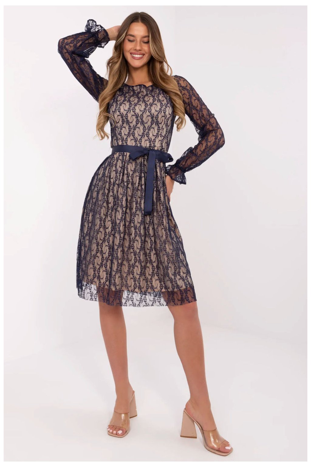 Elegantní koktejlové šaty s rozkročeným střihem, které spojují klasiku s jemným nádechem romantiky. Vyrobené z vysoce kvalitní směsi bavlny, polyesteru a elastanu, zaručují pohodlí nošení a krásné padání na postavě. Krajka vrchní vrstva dodává šatům jedinečný šarm, zatímco podšívka zajišťuje pohodlí a dokonalé přizpůsobení. Klasický kulatý výstřih a dlouhé rukávy zdůrazňují elegantní charakter kreace. Šaty mají délku nad kolena, což z nich činí ideální volbu jak na společenské události, do práce, tak i na večírek. Skrytý zip na zádech usnadňuje oblékání, a přiložený pásek k uvázání zdůrazňuje pas a přidává celku ženskou eleganci. Nadčasový model pro ženy, které oceňují styl a eleganci!